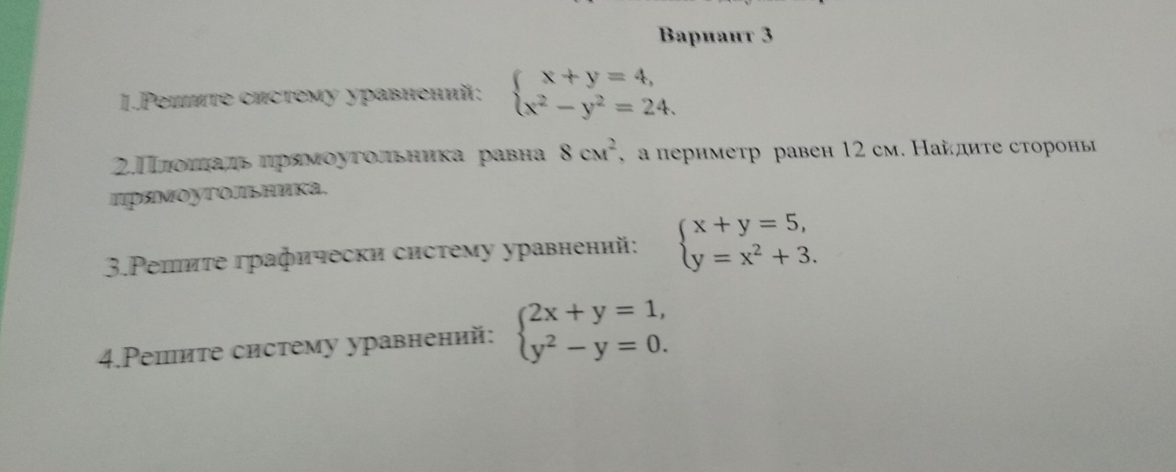 1)x = 4 - y \  {x}^{2}  -  {y}^{2}  = 24 \ {(4 - y)}^{2}  -  {y}^{2}  = 24 \ 16 - 8y +  {y}^{2}  -  {y}^{2}  = 24 \ 8y =  - 8 \ y =  - 1