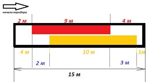 Два маляра красят 15- метровый коридор. Каждый из них движется от начала коридора в его конец и в какой-то момент начинает красить, пока не кончится краска. У первого маляра есть красная краска,и ее хватит на покраску 9 метров коридора:у второго -желтая краска,ее хватит на 10 метров. Первый маляр начинает красить,когда оказывается в двух метрах от начала коридора,а второй заканчивает красить,когда находится в метре от конца коридора. Сколько метров коридора покрашено ровно в один слой?