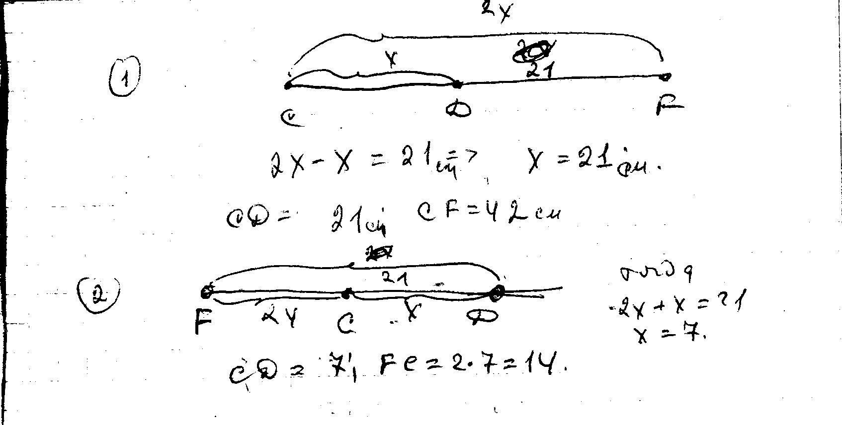 айдите длины отрезков CD и CF,если DF=21см,а отрезок CF в 2 разабольше отрезка DC