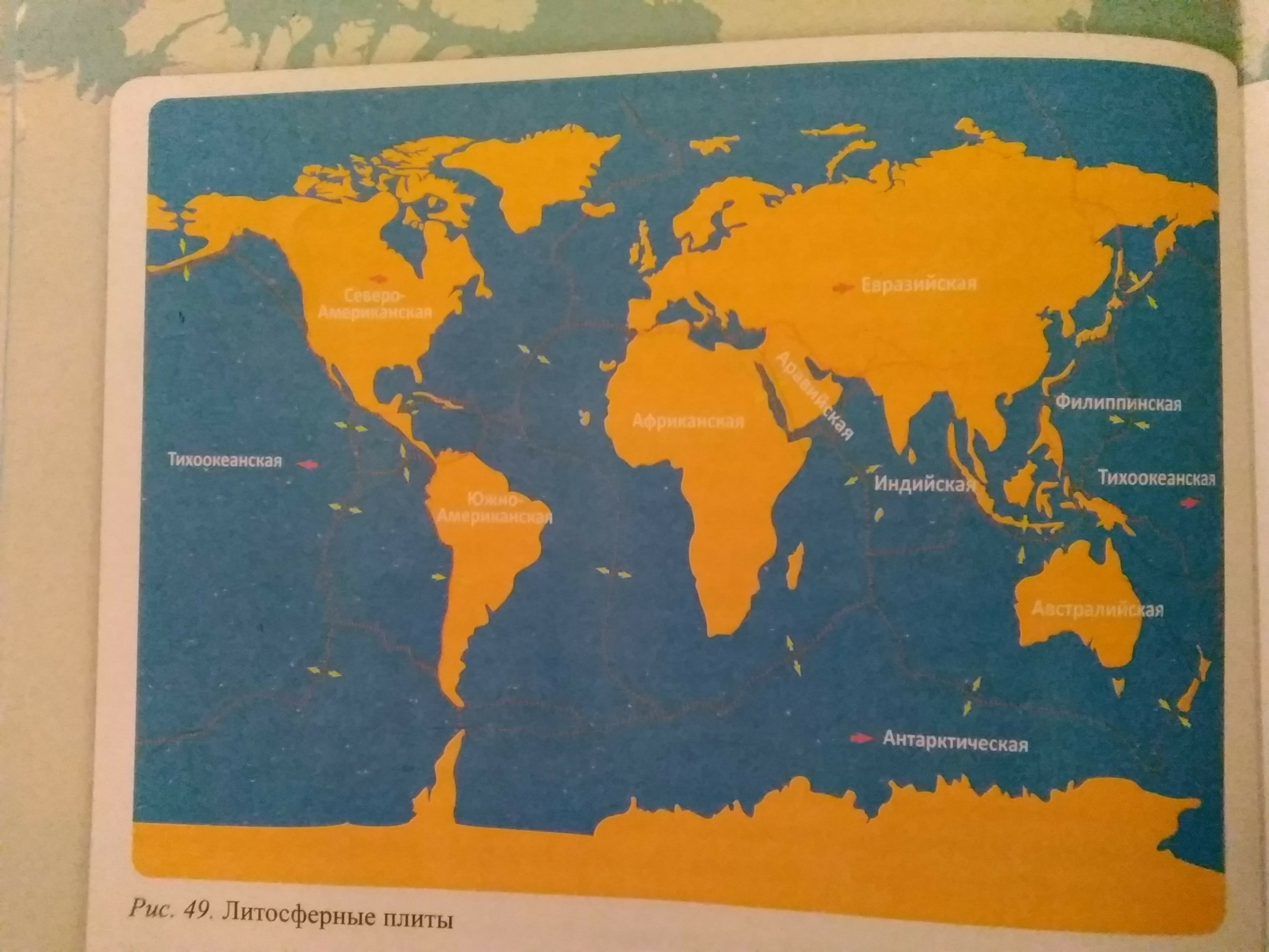 Рассмотрите рисунок 49. Укажите количество литосферных плит. Сопоставьте рисунок с картой строения литосферы и определите название каждой плиты. Какие из плит будут иметь два слоя, а какие три
