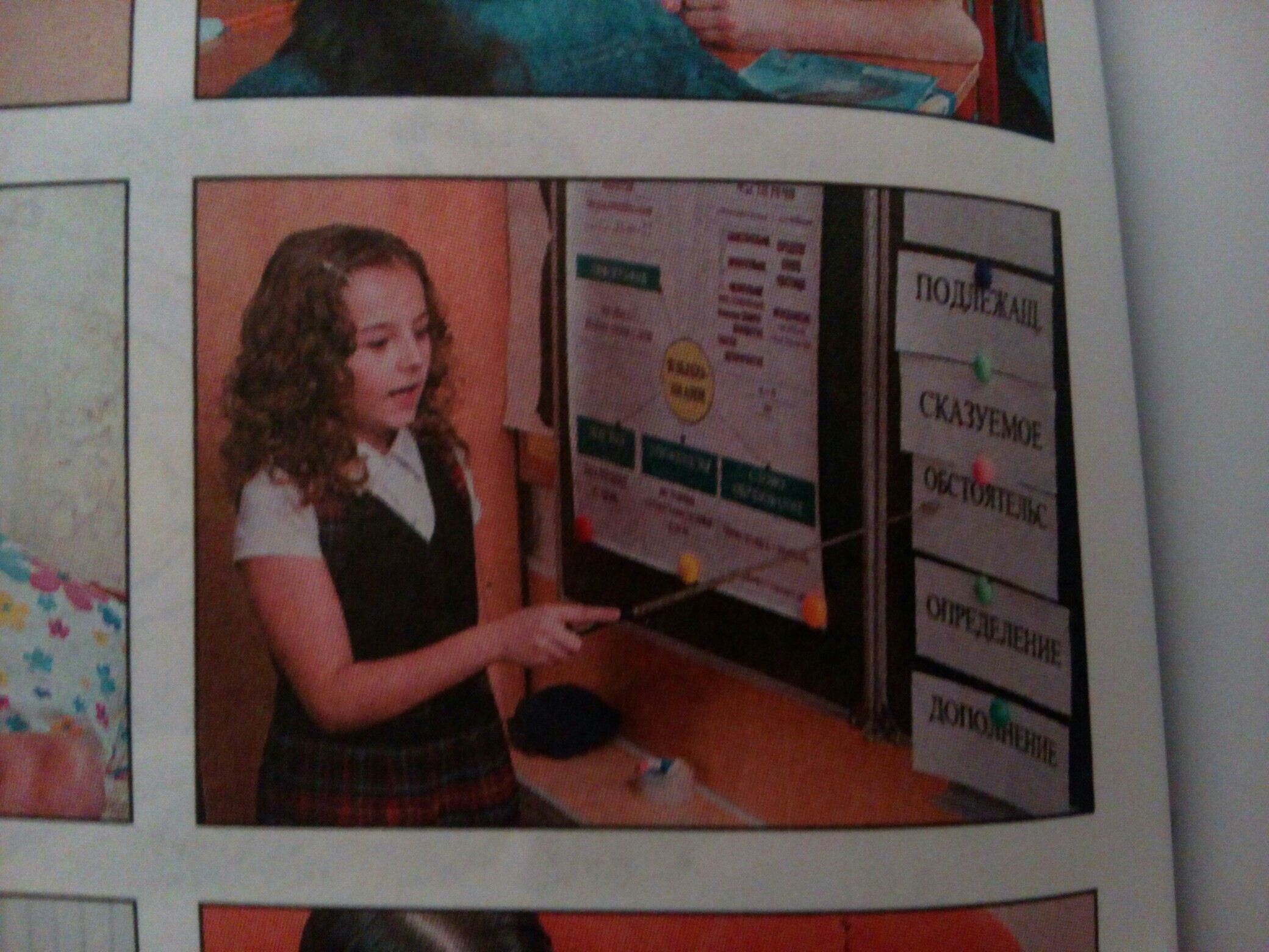 На картине мы видим девочку. Видно, что она изучает русский язык. Она что -то рассказывает классу и внимательно смотрит на таблички. у нее волнистые рыжие волосы. также есть заколочка. одета она в школьную форму. ее рот немного приоткрыт. на школьной форме у нее брошка. на доске висят таблички, их держат разноцветные магнитики. сама она показывает на "обстоятельство".