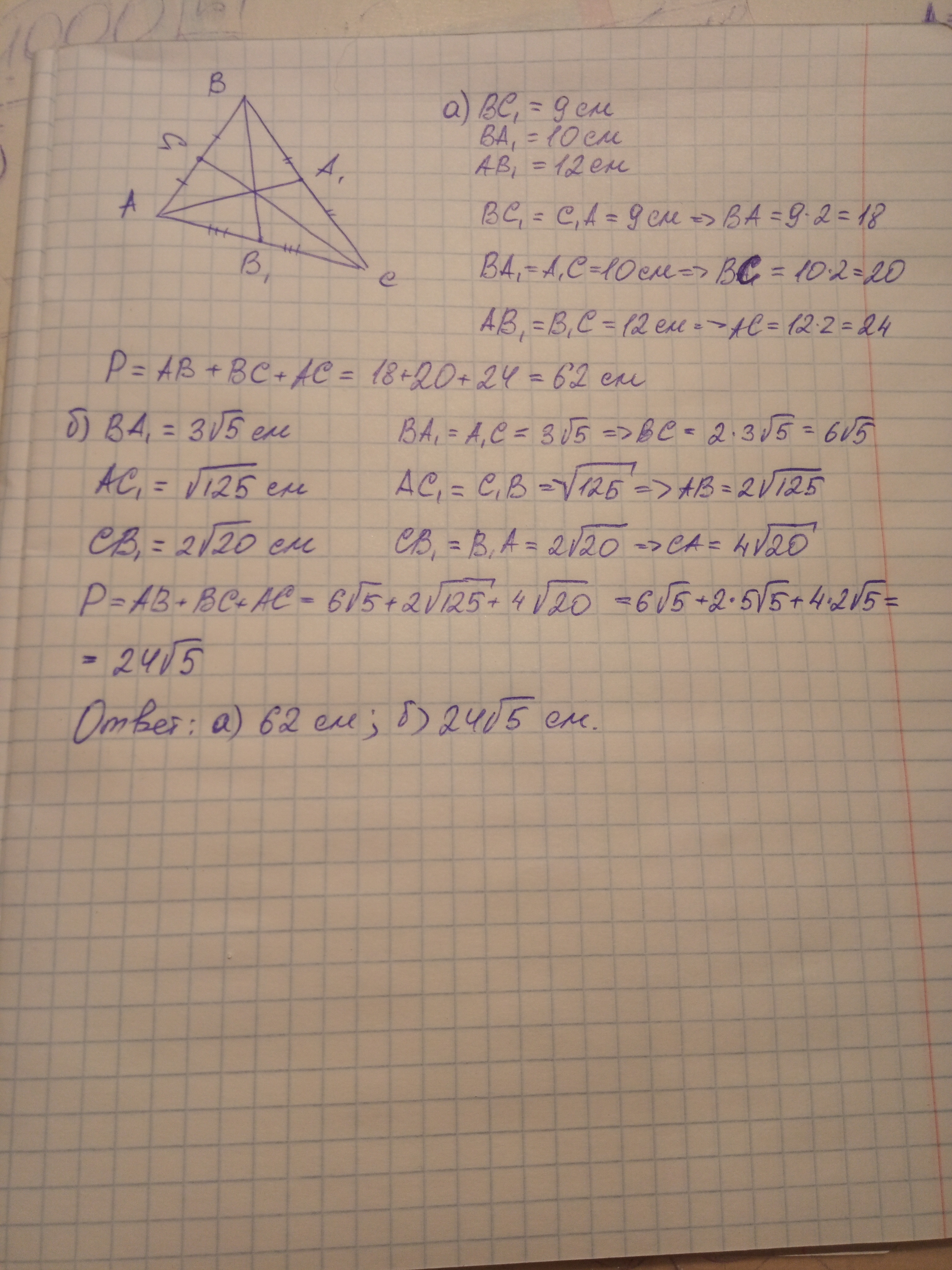 Медиана делит сторону на 2 равных отрезка, одна часть отрезков нам дана ---> находим стороны треугольника ---> находим периметр
