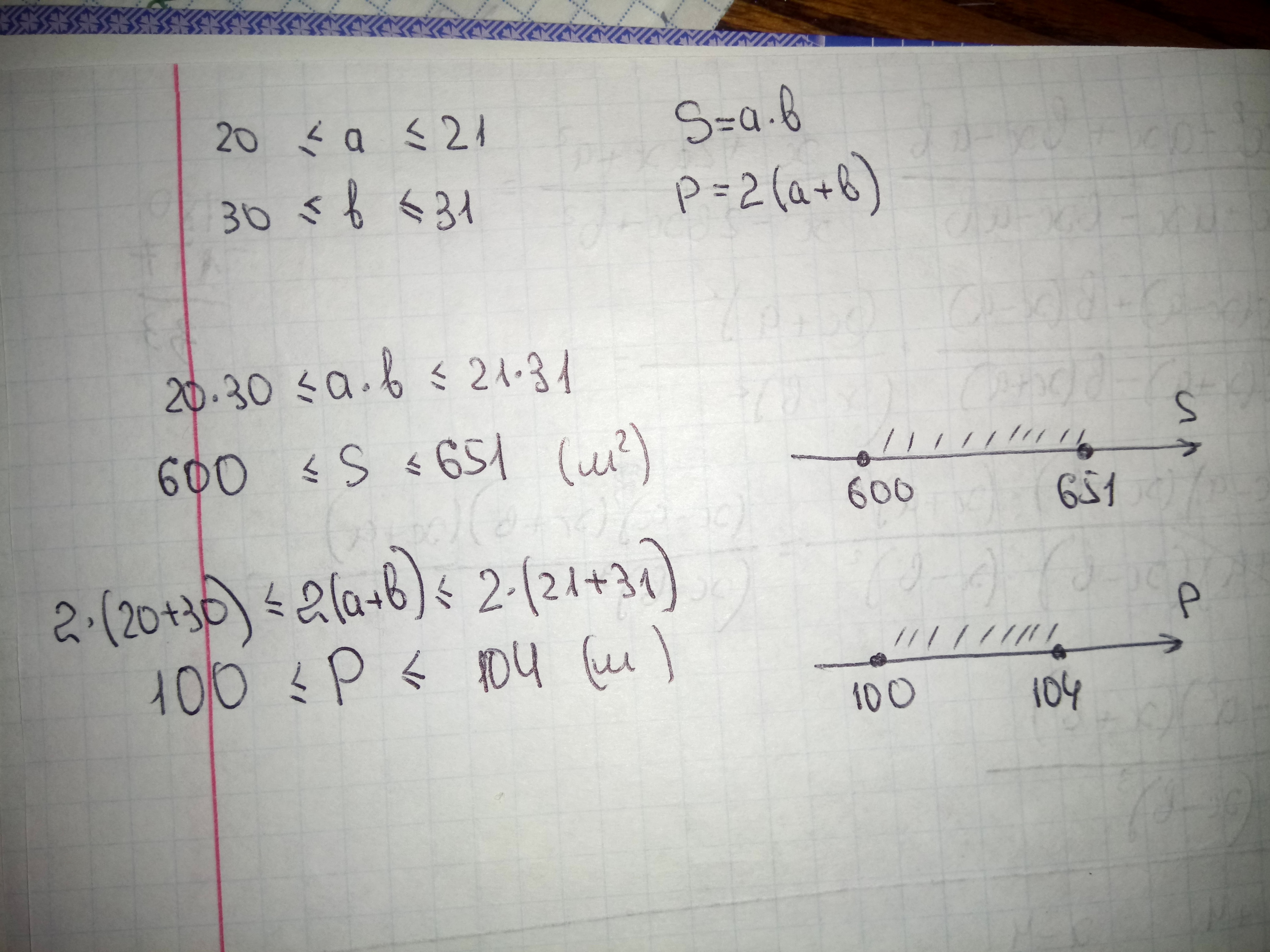 Оцените площадь и периметр участка прямоугольника формы со сторонами а м и в м, если 20≤ а ≤21, 30≤ в ≤31.