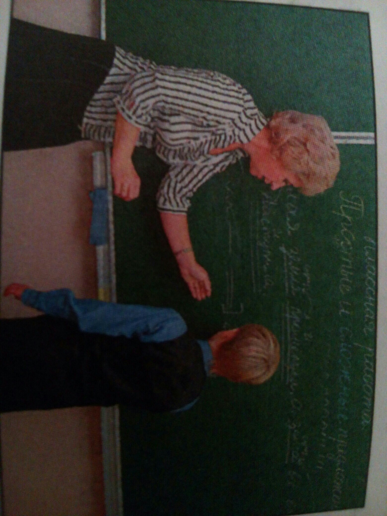 На переднем плане мы видим женщину(учительницу), которая объясняет мальчику схемы (урок). Учительница старается объяснить тему понятно. Т к выражение ее лица говорит нам об этом. Ученик одет в синюю рубашку, а сверху жилет. Он пытается понять тему(возможно понял) и что-то пишет. Учительница одета в красивую полосатую рубашку и юбку. Ее руки показывают на доску(наверно она показывает мальчику, как делать это задание). Видео, что она что-то ему рассказывает. Волосы у нее светлые. На руке браслет. надеюсь хоть немного помогла.