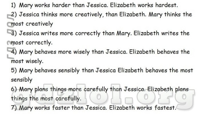 3) Джессика пишет правильнее, чем Мэри. Элизабет пишет правильнее всех. 4)Мэри ведет себя более мудро, чем Джессика. Элизабет ведет себя мудрее всех.