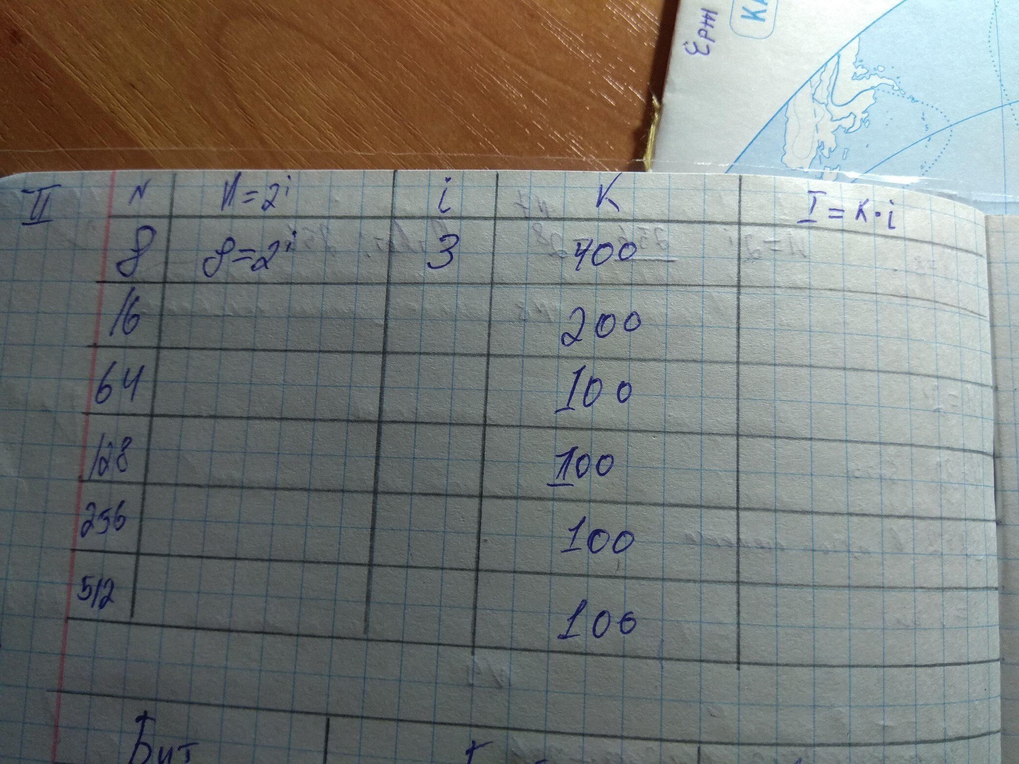 Во второй колонке надо понять, 2 в какой степени является число в первой колонке. Например, 8 это 2 в 3-ей степени, i = 3. В последней колонке перемножаешь K на i, 400*3 = 1200