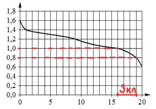 Отмечаем на графике расстояние от 1В до 0,8В. По оси времени видим 3 клетки, значит это 3 часа.