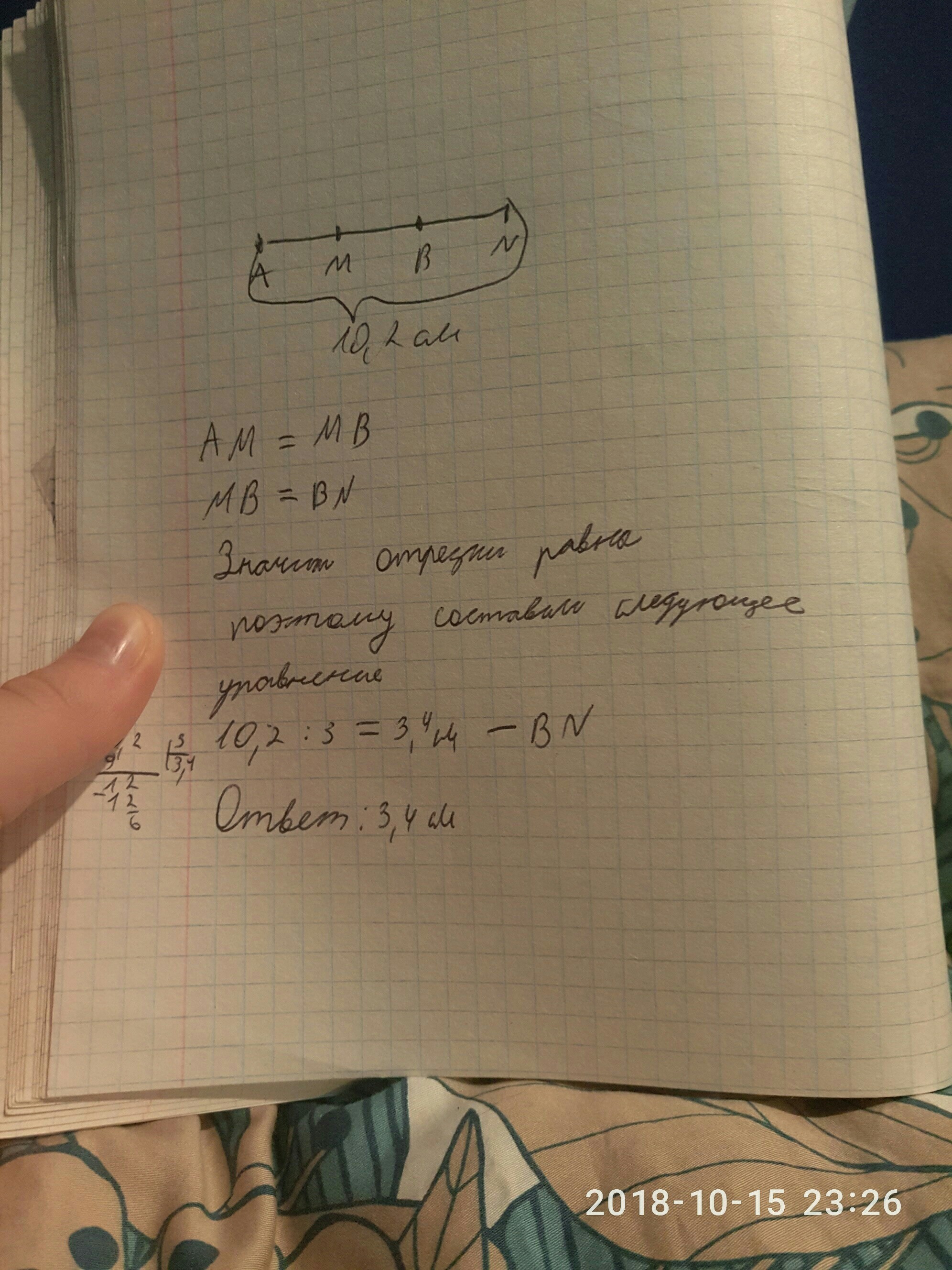 Если точка А середина отрезка АБ и точка Б середина точки МН и длина отрезка АН 10,2см . то получается все точки находятся на одном расстоянии, значит нам надо 10,2:3=3,4см