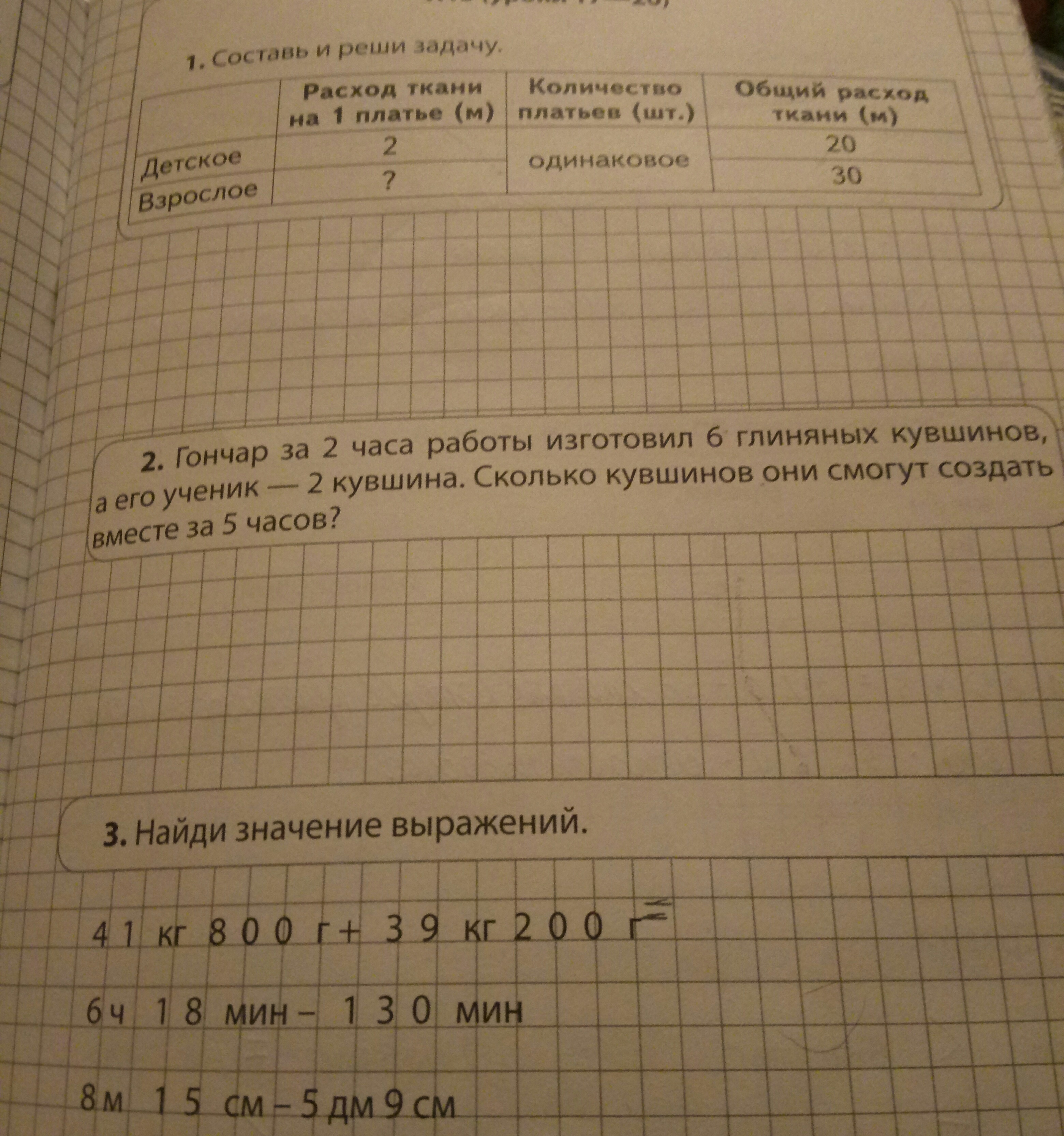 Если вы про второе задание, то вместе гончар с учеников смогут изготовить 20 глиняных кувшином. Находиться это просто: делим 6 на количество часов и получаем 3, это число кувшинов, изготавливаемое за 1 час, делаем то же самое с учеником и получаем, что ученик изготавливает 1 кувшин в час. Теперь умножаем 3 на 5 и получаем, что за 5 часов гончар изготовит 15 кувшинов, и таким же методом получает, что ученик за 5 часов изготовит 5 кувшинов. Складываем 15+5=20, это и ответ.