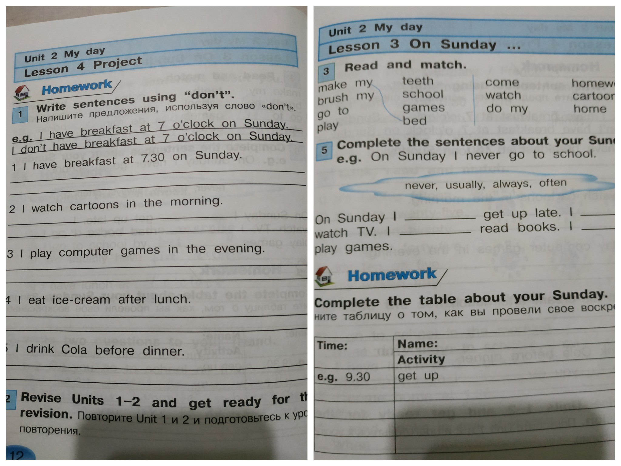 On Sunday I usually get up late.I always watch TV. I never read books. I often play games.