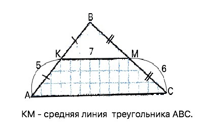 Дано: АВС - треугольник. КМ =7 – средняя линия. Значит, АК=КВ=5 и СМ=МВ=6. Средняя линия треугольника соединяет середины двух его сторон и равна половине третьей. АС=2•КМ. Периметр - сумма длин всех сторон ∆ АВС. Р=2 АК+2ВС+КМ•2=. 10≈12+14=36 м