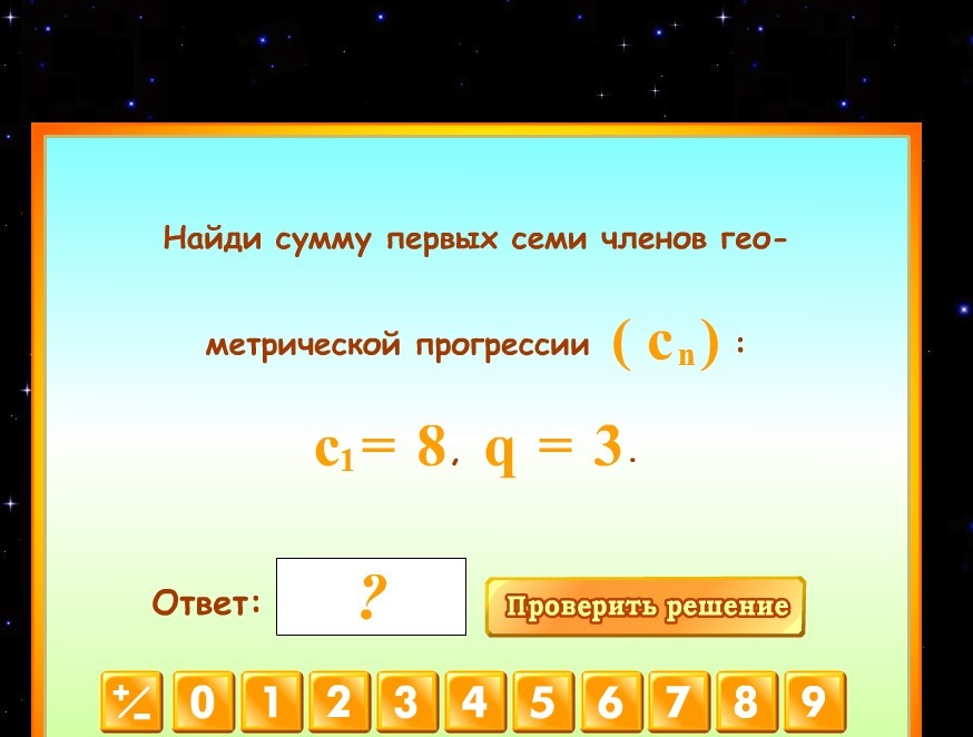 Сумма первых n членов геометрической прогрессии находится по формуле Sn=c1*(qⁿ-1)/(q-1). В данном случае c1=8, q=3, n=7. Подставляя эти значения в формулу, находим S7=8*(3⁷-1)/(3-1)=4*(3⁷-1)=8744. Ответ: 8744.