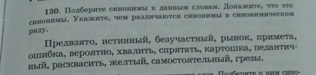 Предвзято-не объективно, истинный- верный, безучастный- безразличный,рынок-базар, примета-признак, ошибка-сбой,вероятно-вернее всего, хвалить своих являть,спрятать-скрыть, картошка- картофель, педантичный- щепетливвй,расквасить-разбить, желтый-золотой,самостоятельный- независимый, грезы- сноведение.