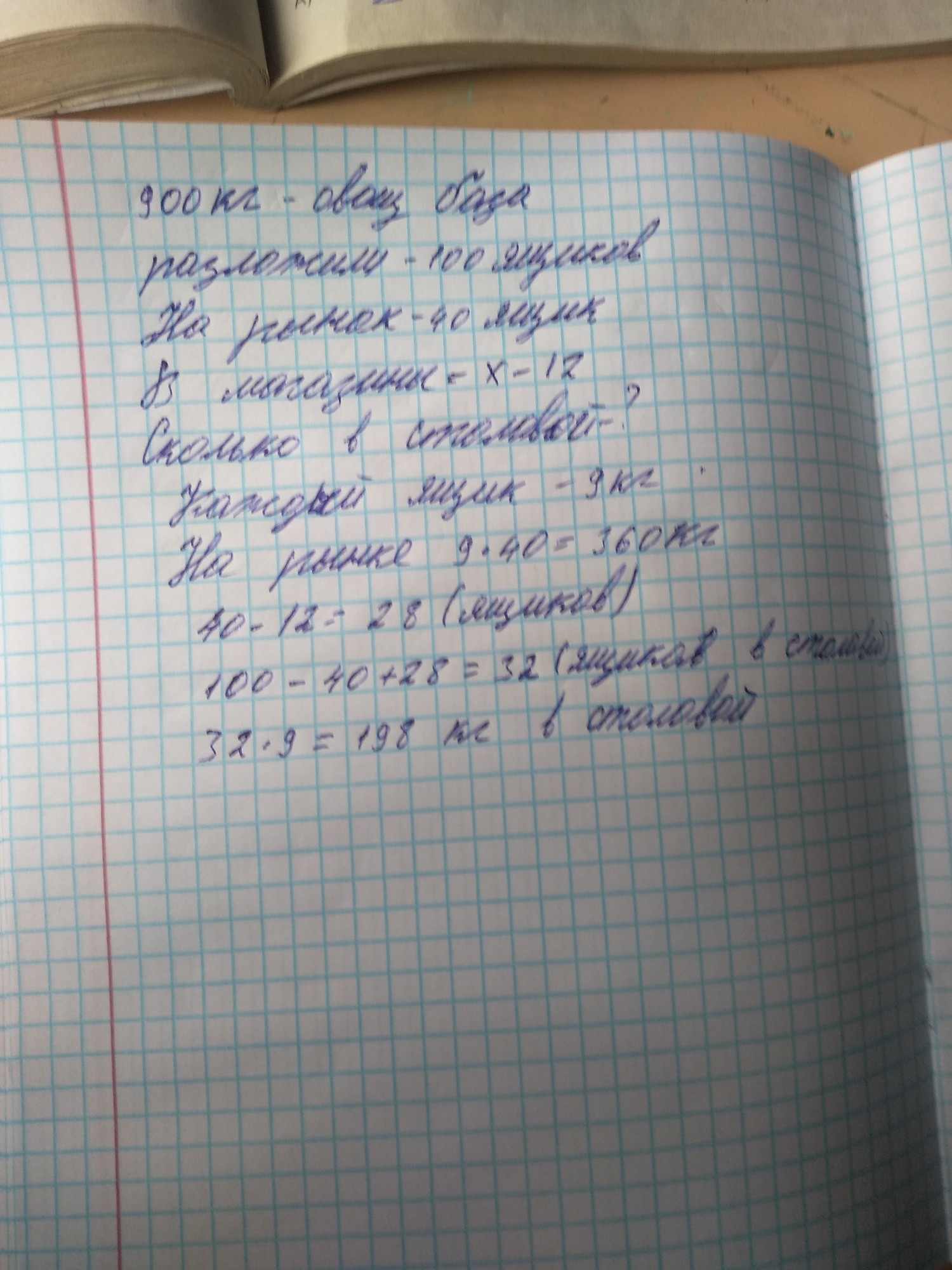 На овощной базе 900кг помедоров разложили в 100ящиков,во все ящики поровну. На рынок отвезли 40ящиков в магазины на 12 ящиков меньше, чем на рынок, а остальные помидоры отвезли в столовые.Сколько килограммов помидоров отвезли в столовые? Ришите