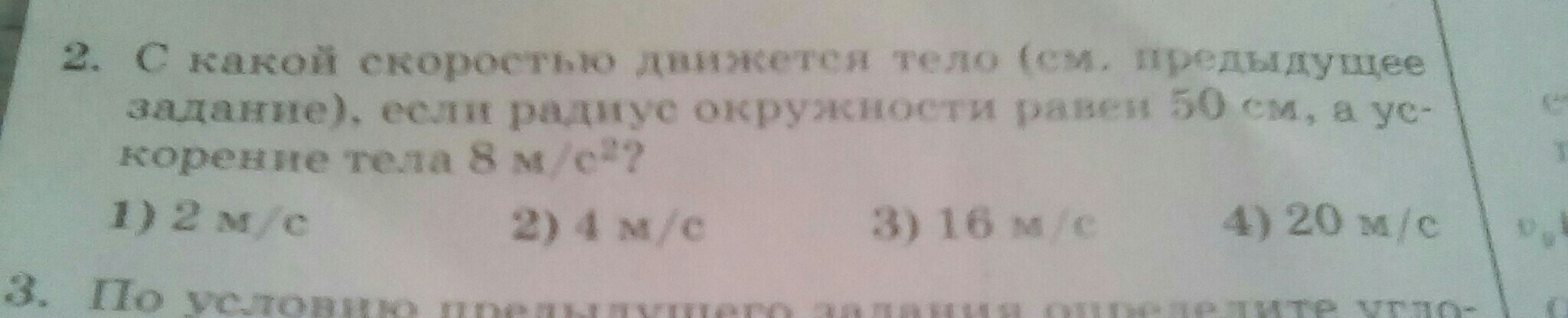 С какой скоростью движется тело если радиус окружности равен 50 см а ускорение тела 8 м с в квадрате 1)2 м с *2,2)4 м с*2,3)16 м с *2,4)20м с*2