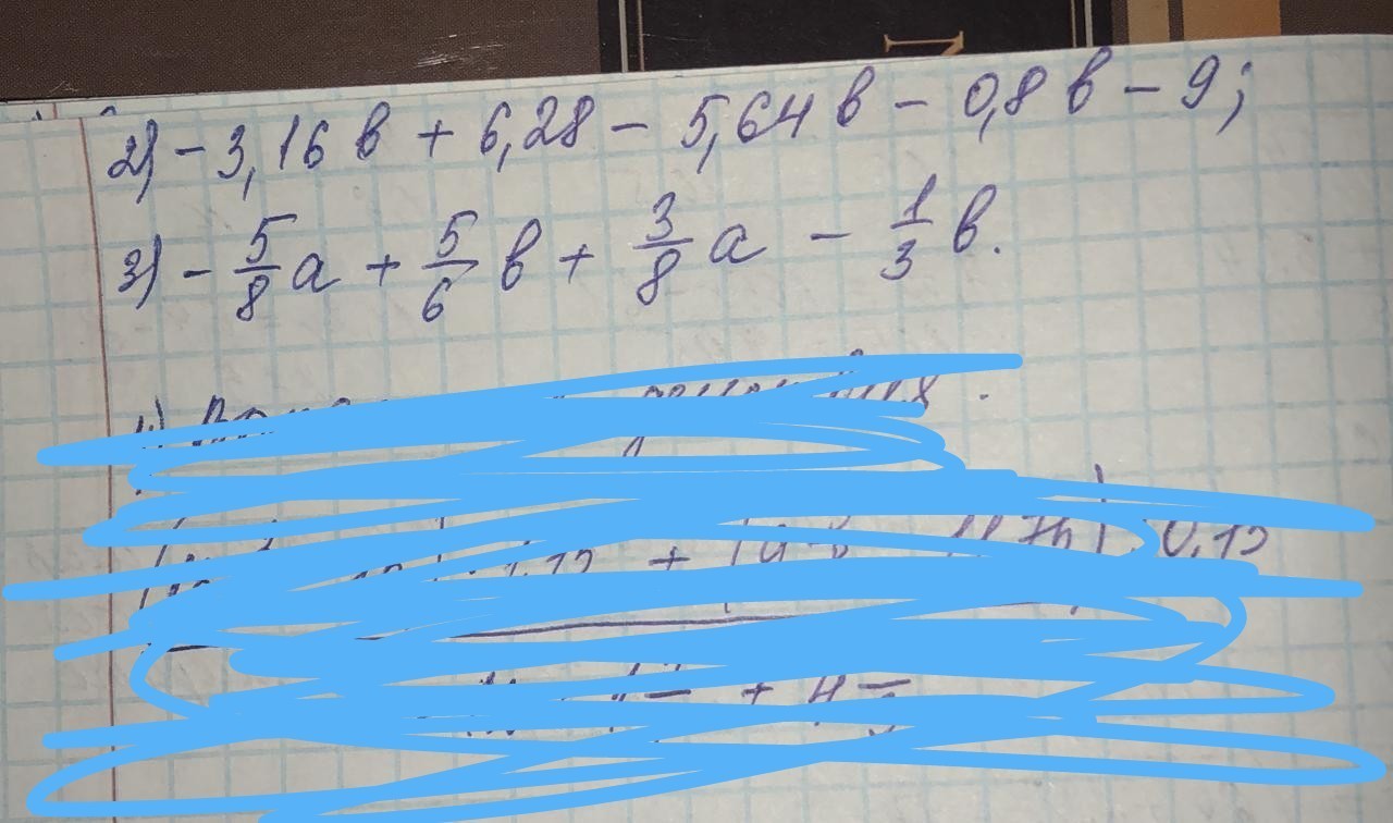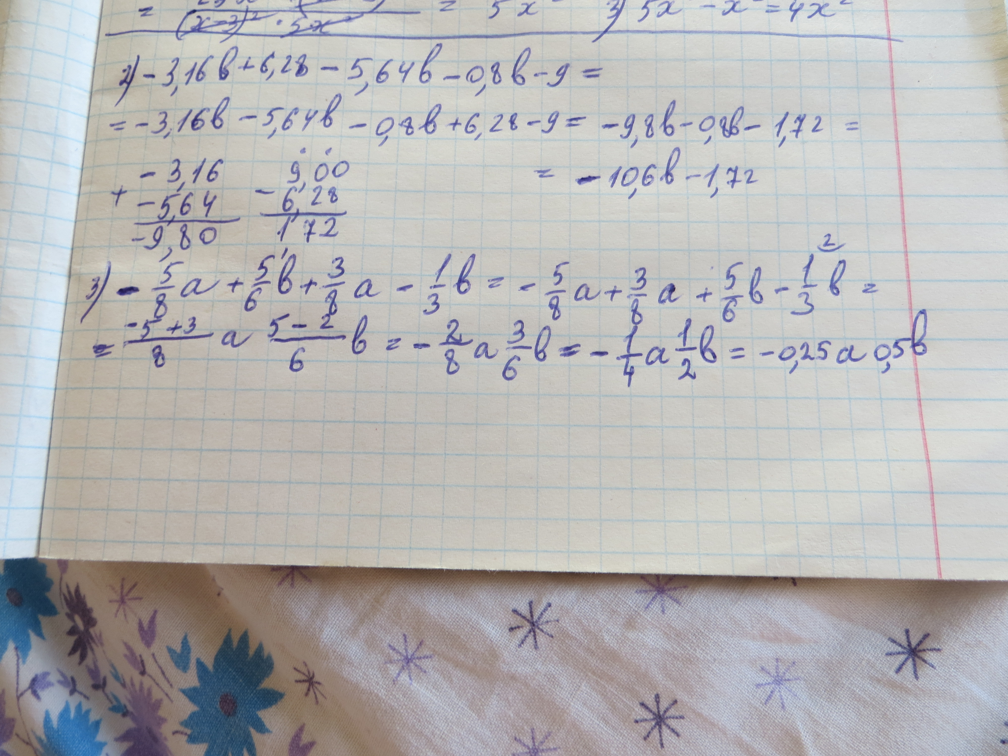 -5/8а + 5/6б + 3/8а - 2/6б = -2/8а + 7/6б = -0,25а + 0,5б