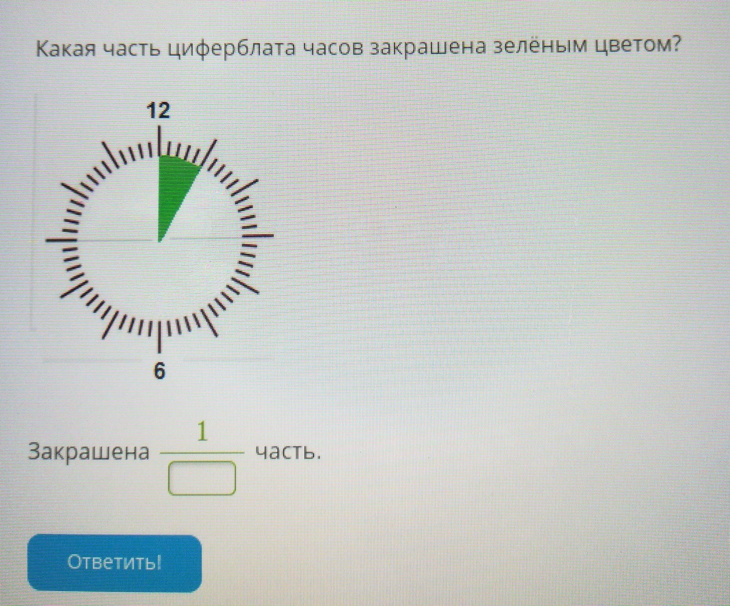 Циферблат разделен на 12 частей, из них закрашена только одна, значит ответ: