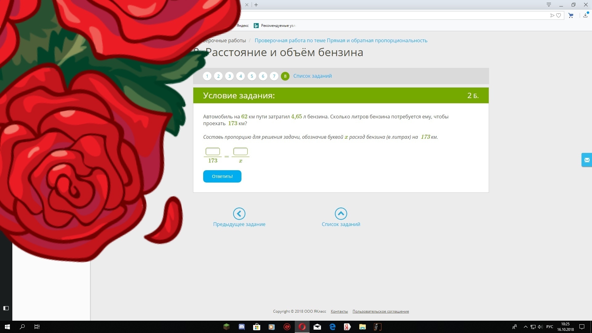 Составь пропорцию для решения задачи, обозначив буквой x расход бензина (в литрах) на 173 км