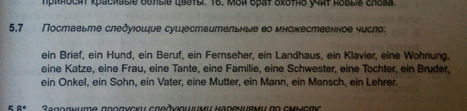 ein Brief - die Briefe, ein Hund - die Hunde, ein Beruf - die Berufe, ein Fernseher - die Fernseher, ein Landhaus - die Landhäuser, ein Klavier - die Klaviere, eine Wohnung - die Wohnungen, eine Katze - die Katzen, eine Frau - die Frauen, eine Tante - die Tanten, eine Familie - die Familien, eine Schwester - die Schwestern, eine Tochter - die Töchter, ein Bruder - die Brüder, ein Onkel - die Onkel, ein Sohn - die Söhne, ein Vater - die Väter, eine Mutter - die Mütter,ein Mann - die Männer, ein Mensch - die Menschen, ein Lehrer - die Lehrer.
