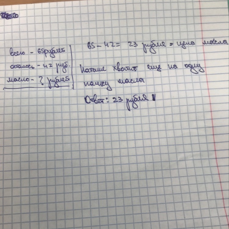 Мама попросила Наташу купить пачку масла и дала ей 65 руб .После покупки масла у Наташи осталось 42 руб,Сколькорублей стоит ?