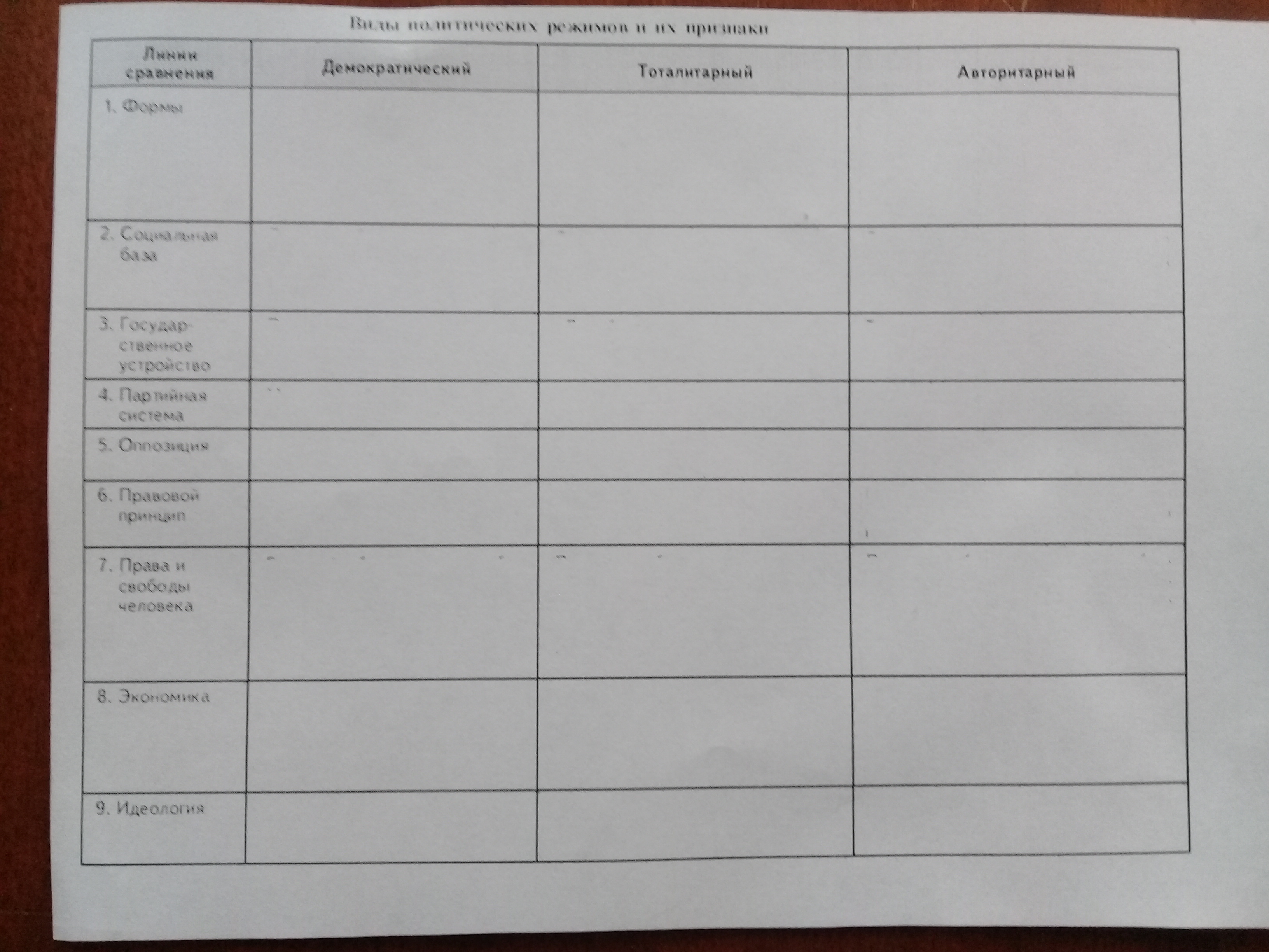 Демократический: 1) Республика, конституционная монархия. 2) Народ. 3) Федеративное/унитарное. 4) Многопартийность. 5) Существует, допускается. 6-7) Присутствуют и защищаются. 8) Как правило, рыночная. 9) Везде разная.