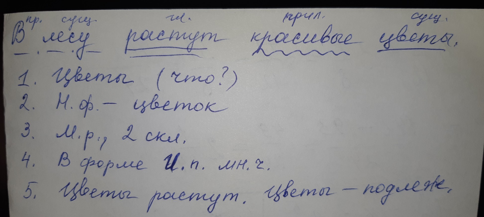 В лесу (дополнение) растут (сказуемое) красивые (определение) цветы (подлежащее)