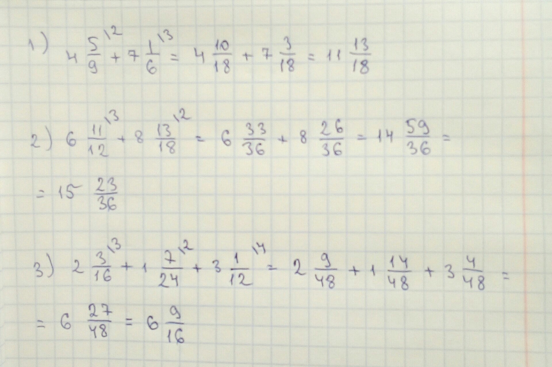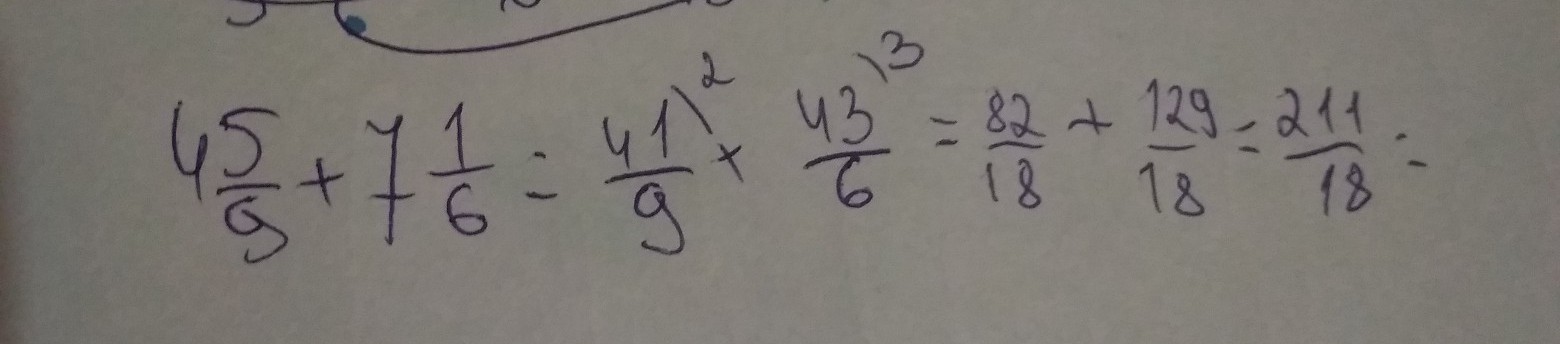 После того как мы перевели нужно найти общий знаменатель,в данном случае 18 теперь нужно домножить 41 на 2 и 43 на 3 получится 82 восемнадцатых + 129 восемнадцатых=211 восемнадцатых так как это неправильная дробь нужно сократить,если сократить получится 11 целых 13 восемнадцатых