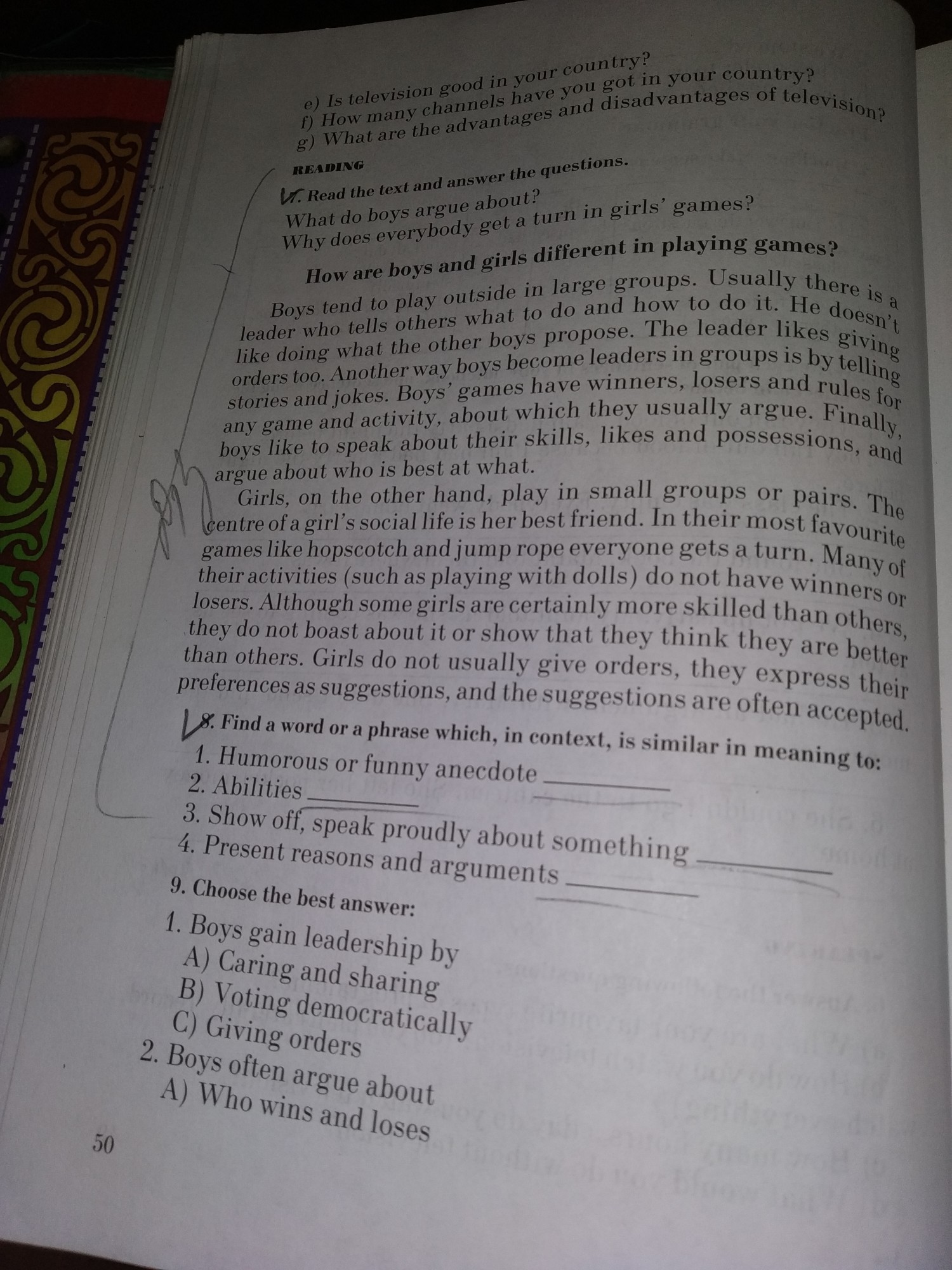 1)joke. 2) skill. 3)boast. 4) conflict.