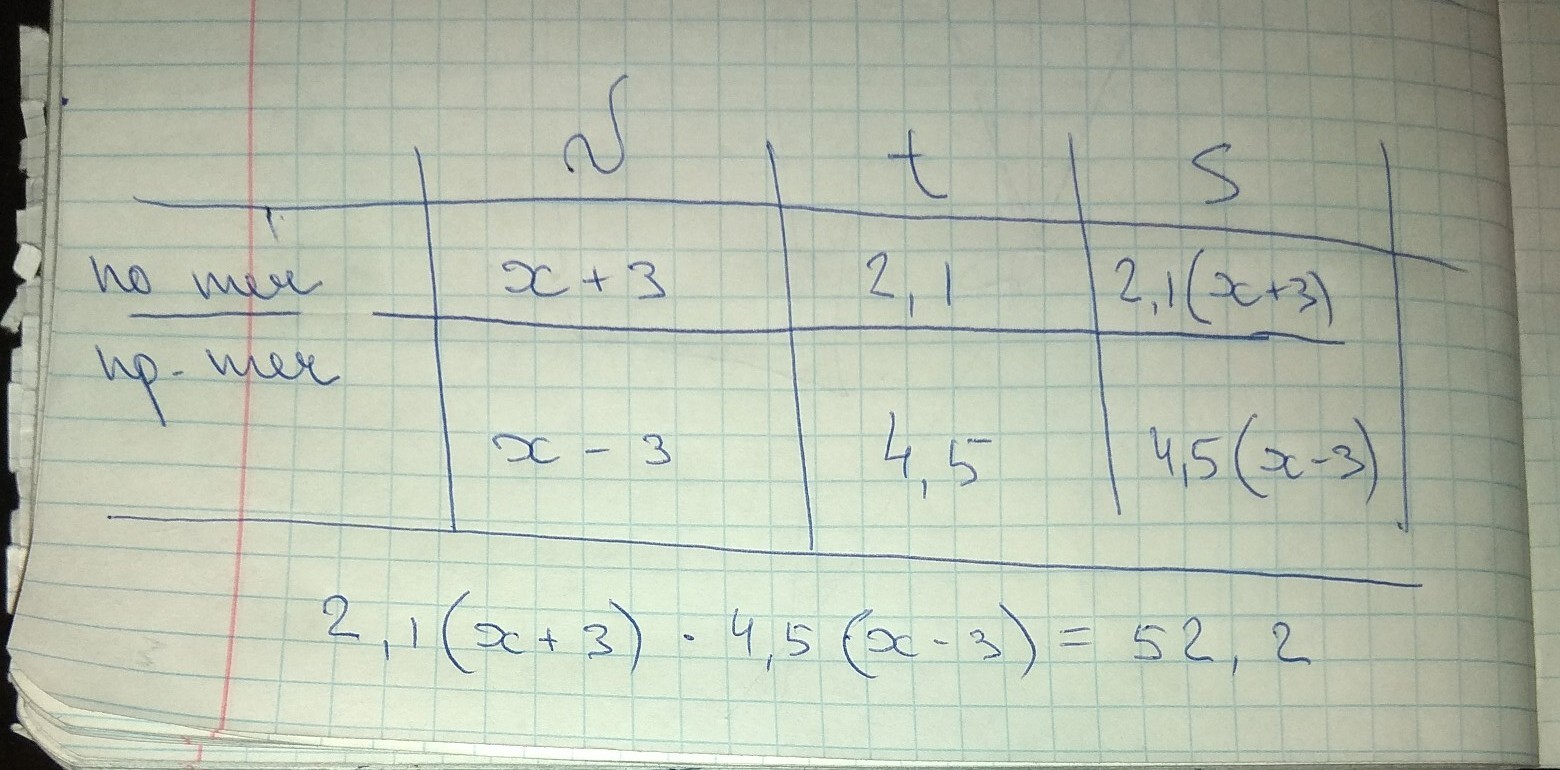 лодка шла против течения реки 4.5 ч. и по течению 2,1 ч. Найти скорость лодки в стоячей воде, если она прошла всего 52,2 км, а скорость течения реки равна 3 км/ч.