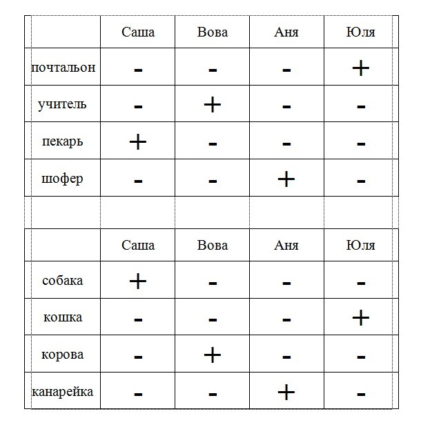 1). Очевидно, что профессия отца Саши - пекарь. Ставим в соответствующей ячейке плюс, в остальных по вертикали и горизонтали - минусы.