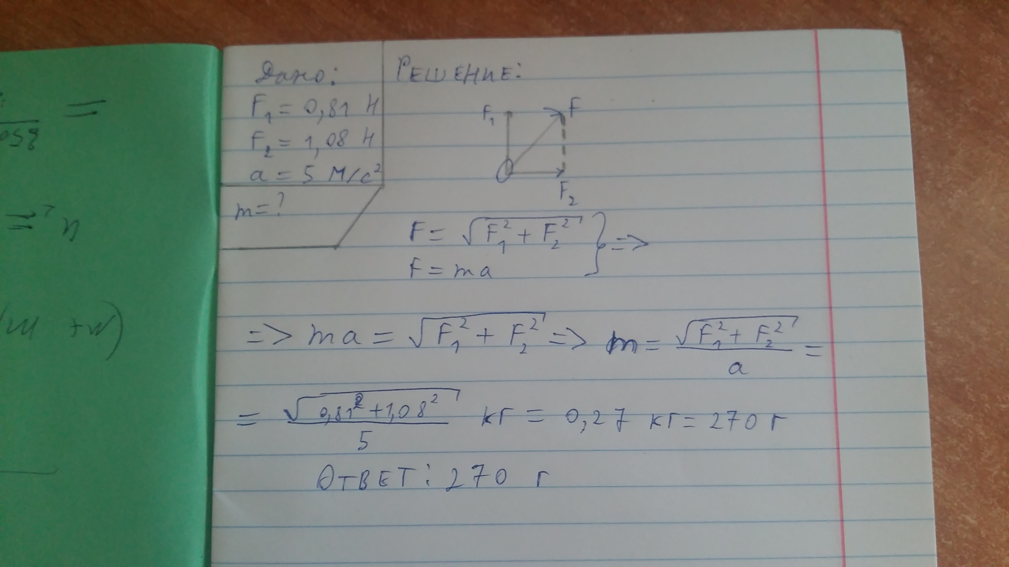 бильярдный шар под действием двух взаимно перпендикулярных сил 0,81 и 1,08 Н приобретает ускорение 5 мс. определить массу шара