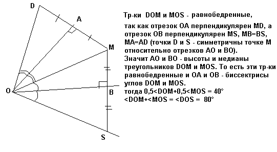 Так как угол SOD = 80°. ( 0,5 угла DOM = 0,5 угла МОS = 40°. Угол DOM+МОS = угол SOD =80°)