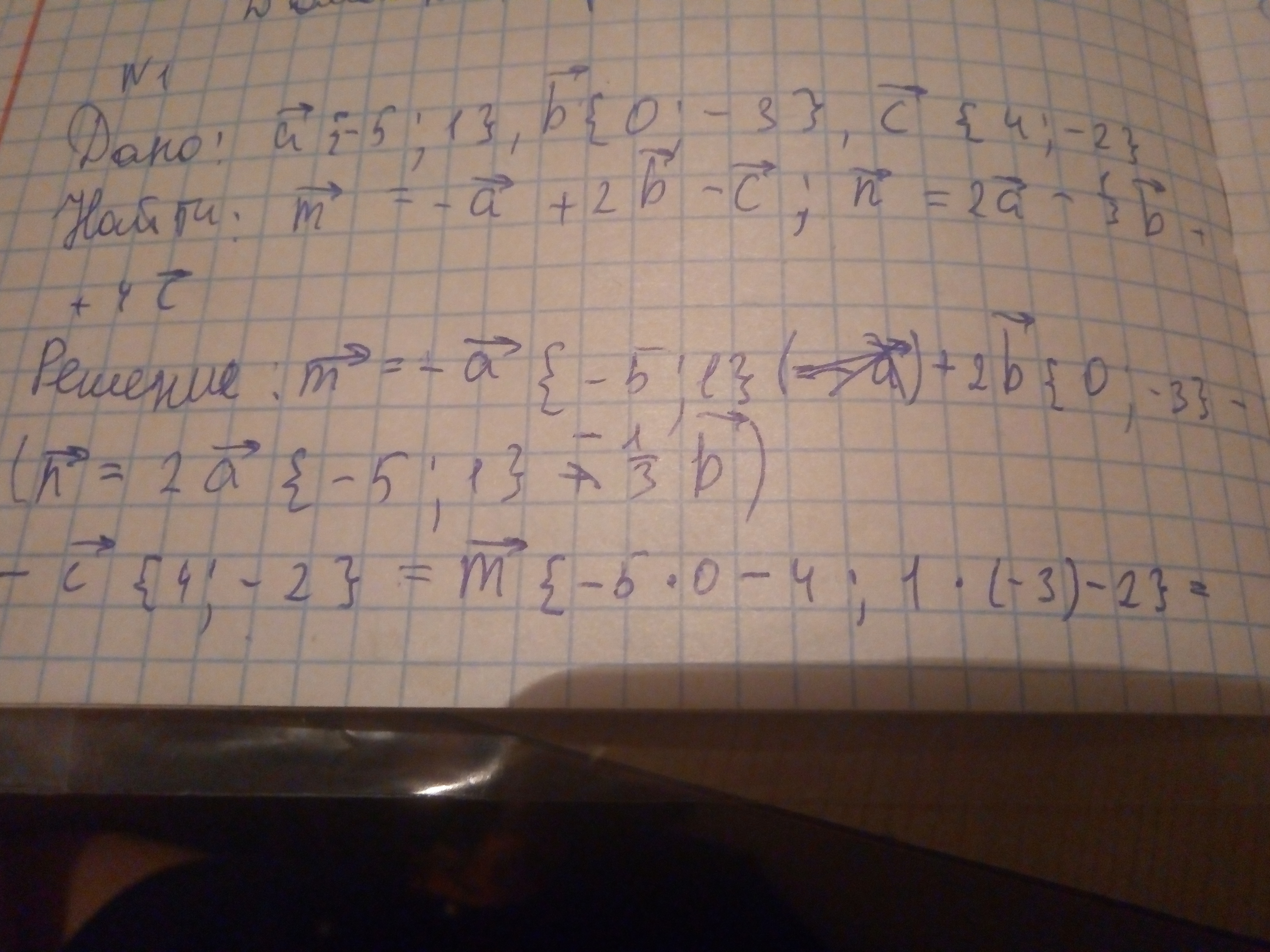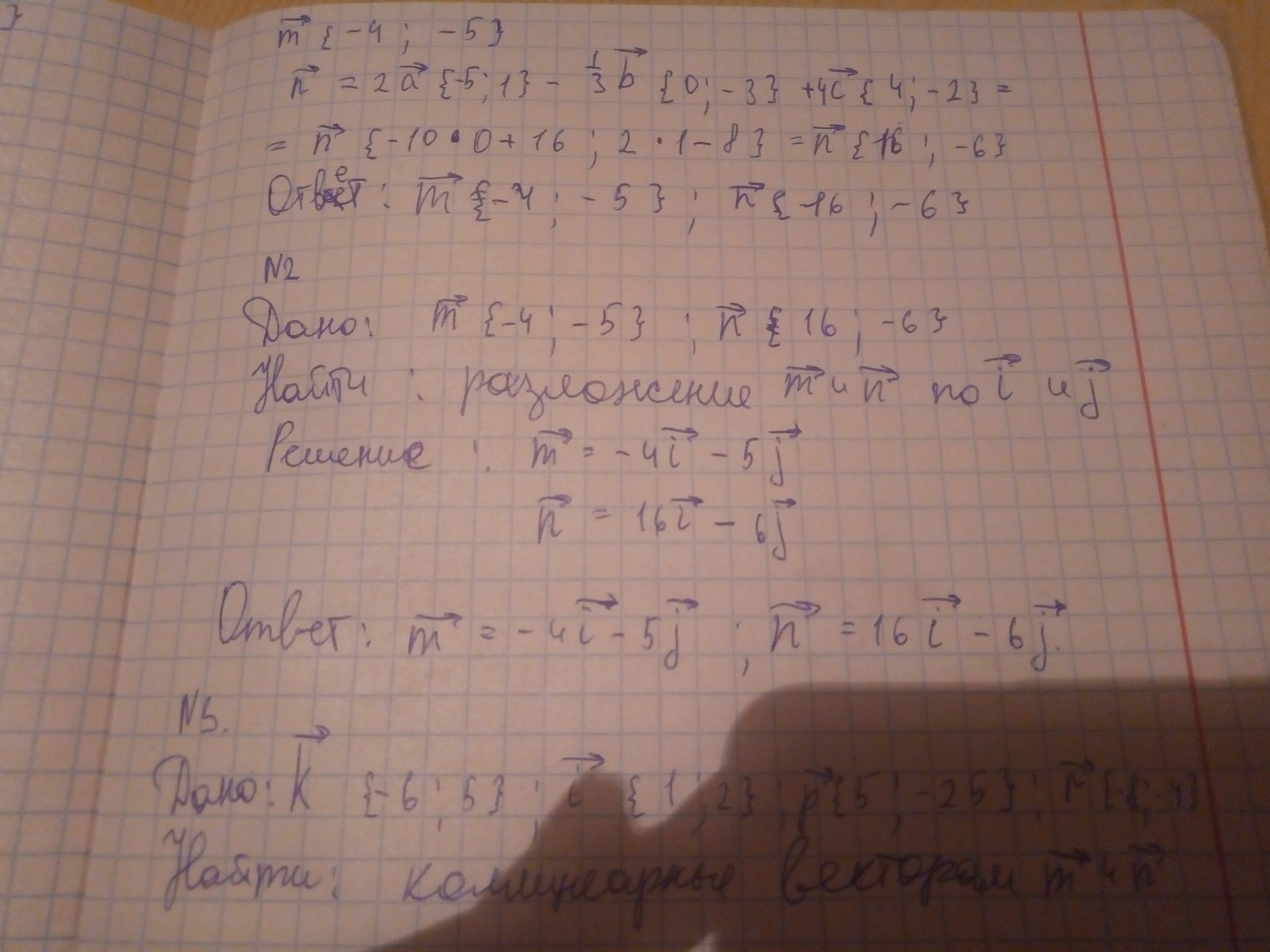 К четырем заданиям указания такие: Векторы а (-5;1), b (0;-3), c (4;-2) №1) Найдите координаты векторов: m = a + 2b - c , n = 2a -1/3b +4c №2) Запишите разложение векторов m и n по координатным векторам i и j №3) Найдите среди векторов k (-6;5), i (1;2), p (5;-25), r (-8;-4) векторы коллинеарные векторам m и n №4) Разложите вектор d по векторам a и b, если d (-10;5)
