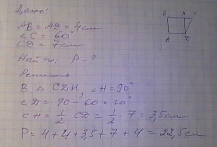 Дана прямоугольная трапеция ABCD. AB=4 см ∠с= 60 градусов .CD=7 см. Найти периметр ABCD.Помогите ,пожалуйста, мне очень надо.