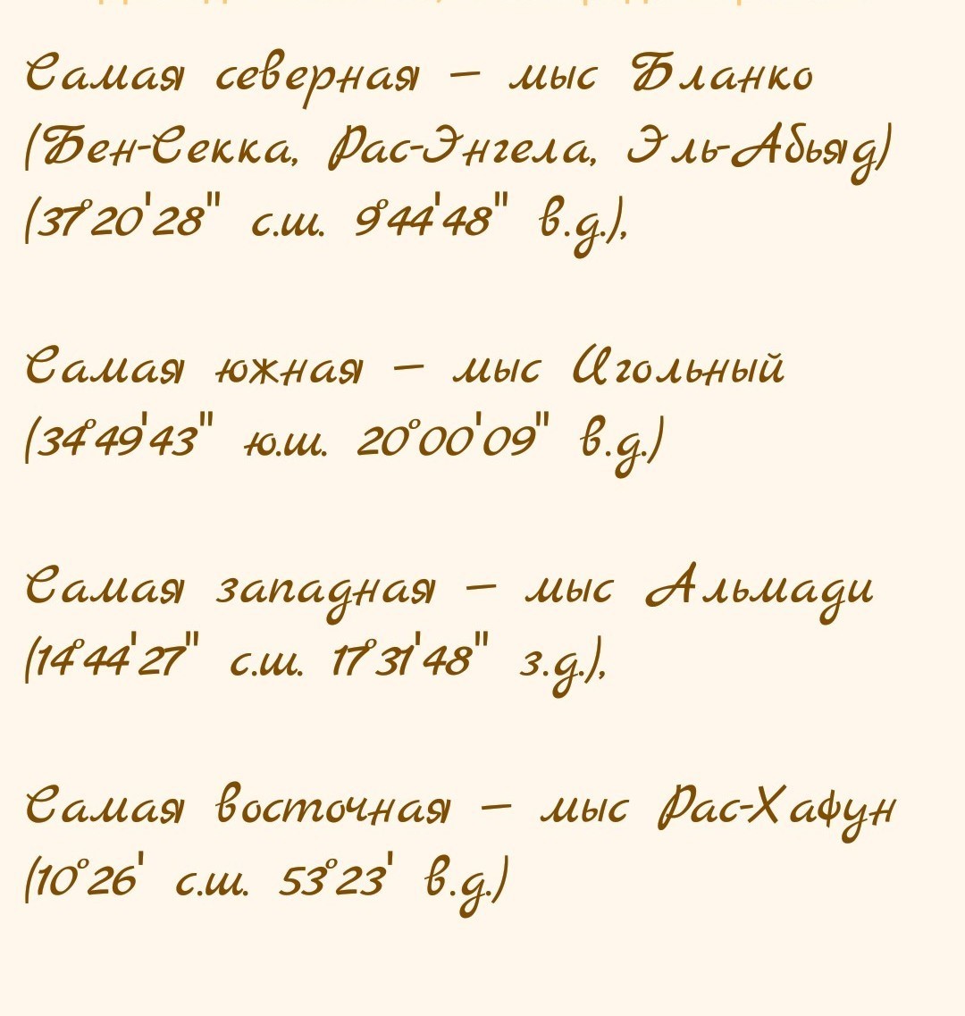 Самая северная — мыс Бланко (Бен-Секка, Рас-Энгела, Эль-Абьяд) (37°20′28″ с.ш. 9°44′48″ в.д.), Самая южная — мыс Игольный (34°49′43″ ю.ш. 20°00′09″ в.д.) Самая западная — мыс Альмади (14°44′27″ с.ш. 17°31′48″ з.д.), Самая восточная — мыс Рас-Хафун (10°26′ с.ш. 53°23′ в.д.)