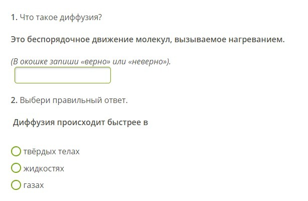 2) Газах (т.к - следует сказать что диффузия при более высокой температуре происходит быстрее)