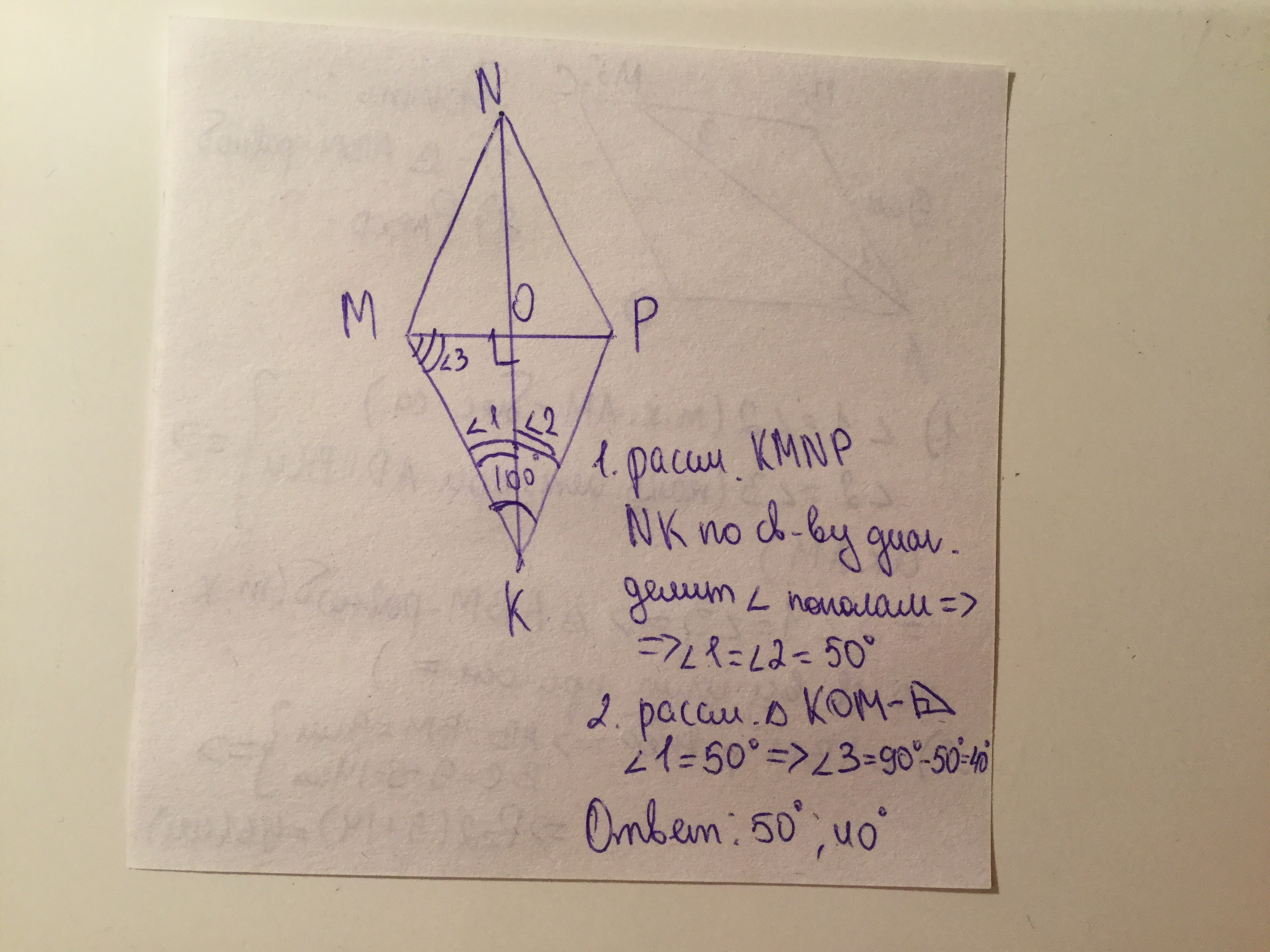 1)Дано : KMNP - ромб , KN принадлежит PM = 0 , угол MKP =100 градусов
