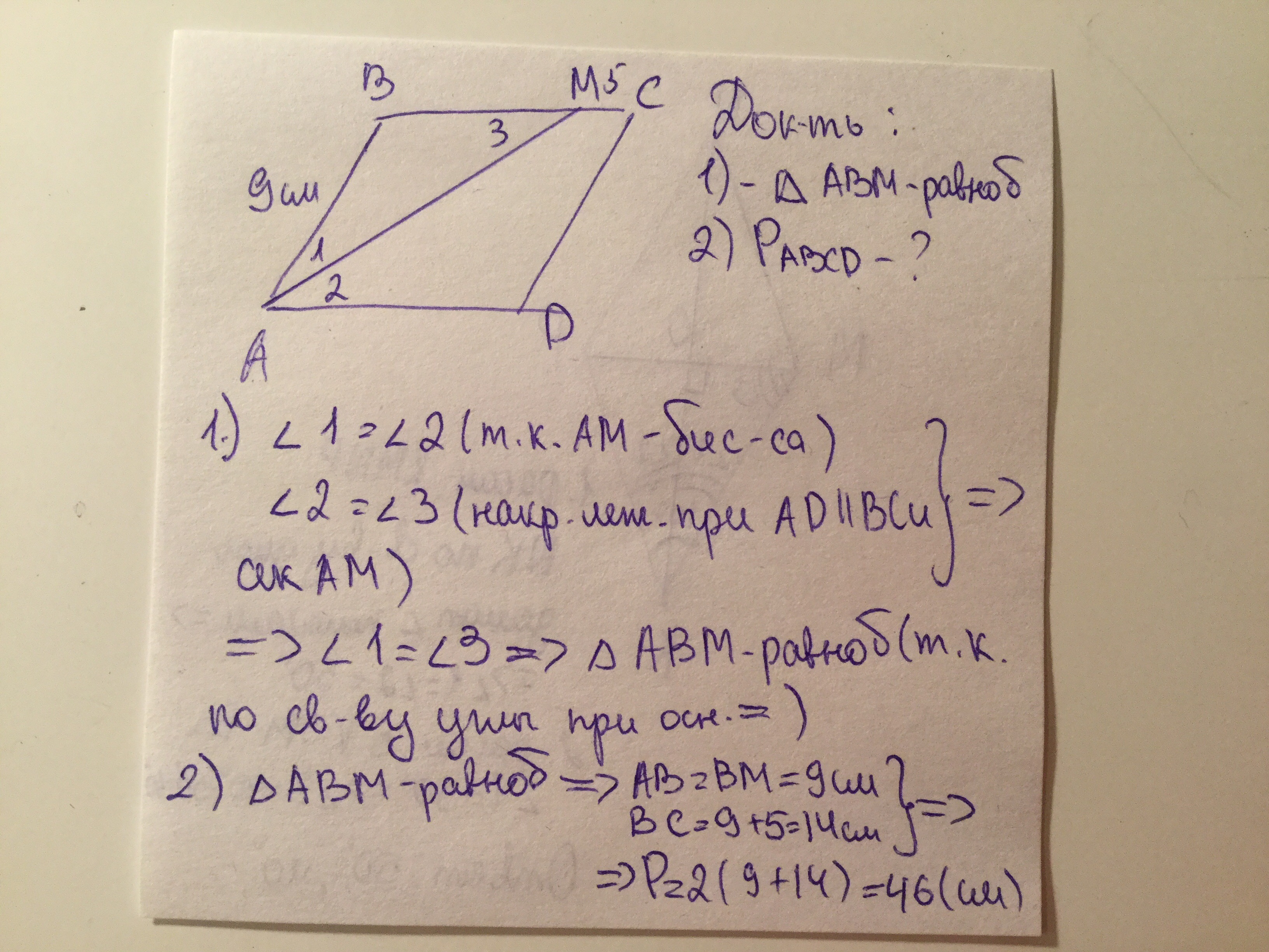 2) ABCD - параллелограмм , AM - биссектриса угла BAD .