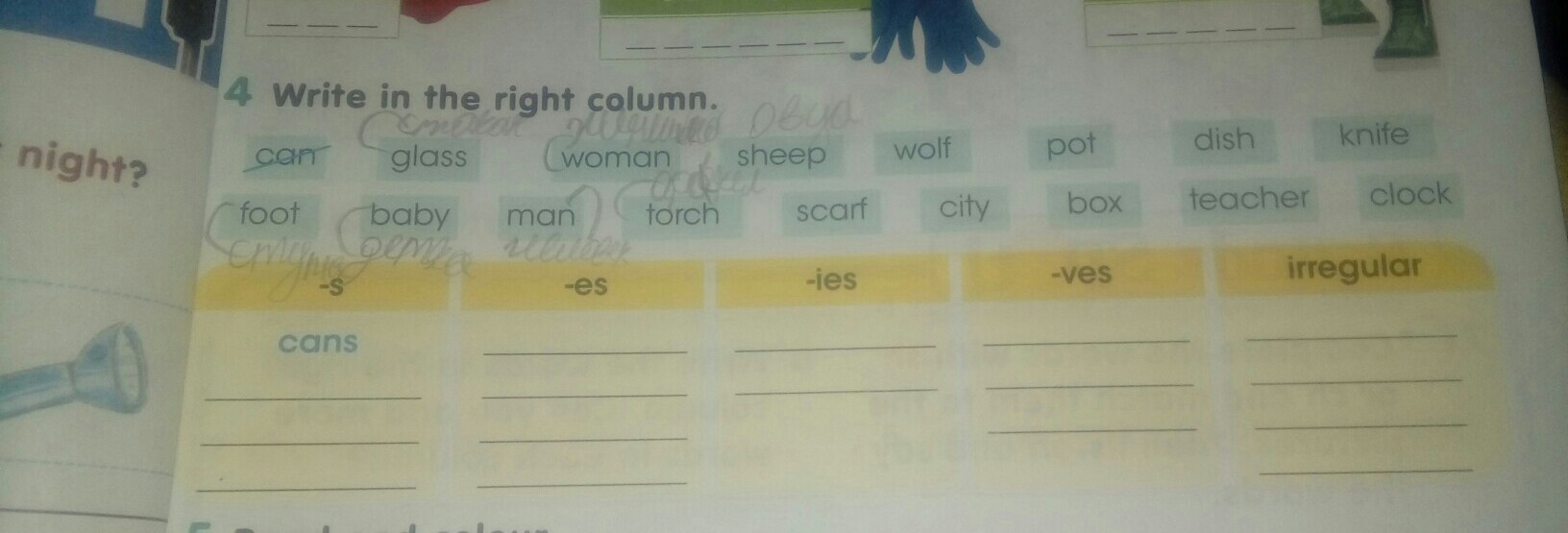 ES: glasses, dishes, knifes, torches, boxes. S: womans, sheeps, wolfs, pots, foots, mans, scarfs, teachers, clocks. IES: babies, cities