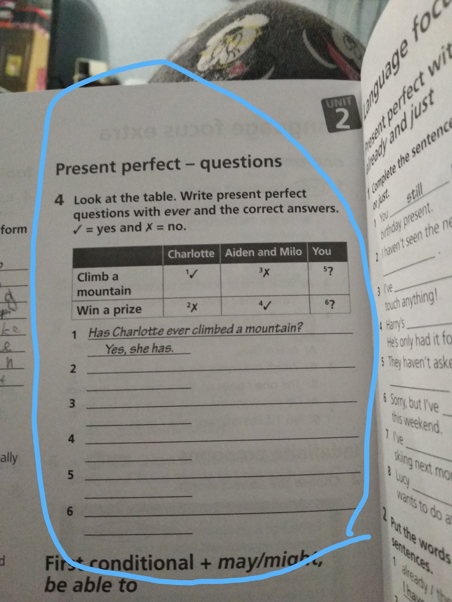 Ну смотри ты читаешь Charlote climb a moutian т е Шарлота и забирается по скалам внизу галочка значит задавай вопрос