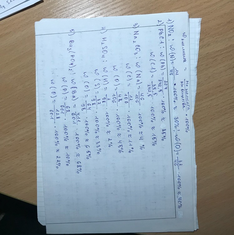 Вычислите массовые доли всех элементов в соединении со следующими химическими формулами:NO2, PbCI, Na2CO, H2SO4,Ba3(PO4)2