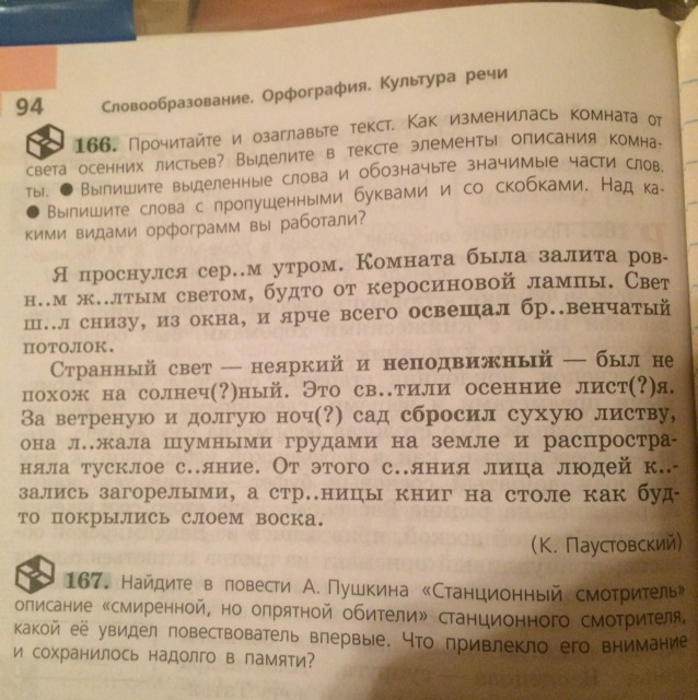 6 класс правильно? Значит ,тебе надо слова выделеные жирным шрифтом разобрать по составу (то есть корень, приставка, окончание и тд.) , а слова со скобками и с пропущенными буквами просто выписать и и буквы вставить