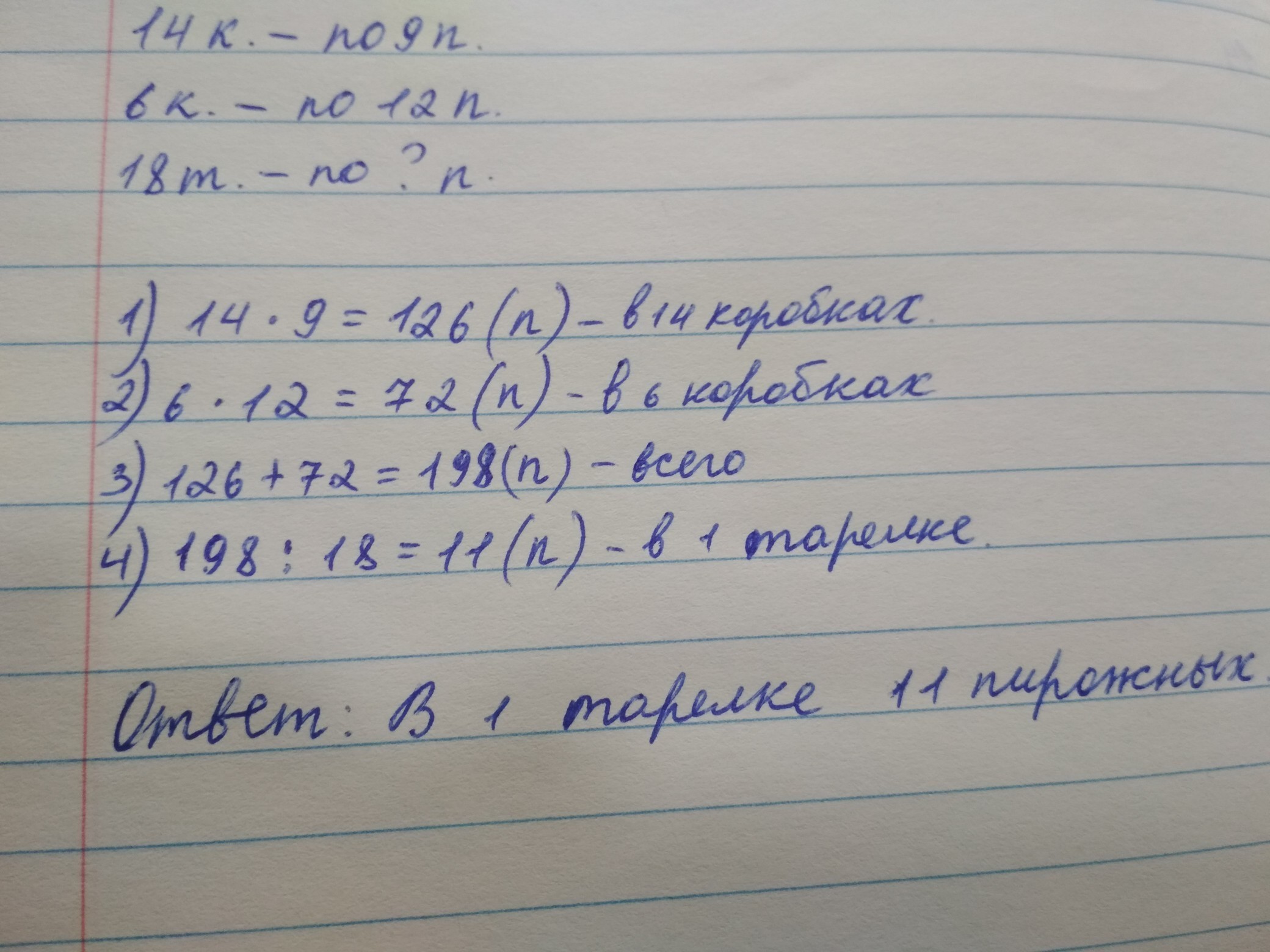 для школьного праздника купили 14 коробок пирожных,по 9 пирожных в каждой, и 6 коробок, по 12 пирожных в каждой. Все пирожные разложили на 18 тарелок поровну. Сколько пирожных на каждой тарелке? напишите условие задачи пожалуйста