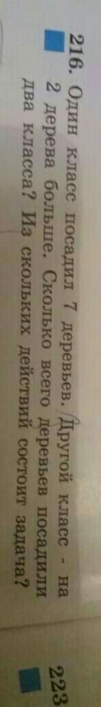 помогите пожалуйста. Один класс посадил 7деревьев другой класс 2дерева больше сколько всего деревьев посадили два класса? Из скольких действий состоит задача?