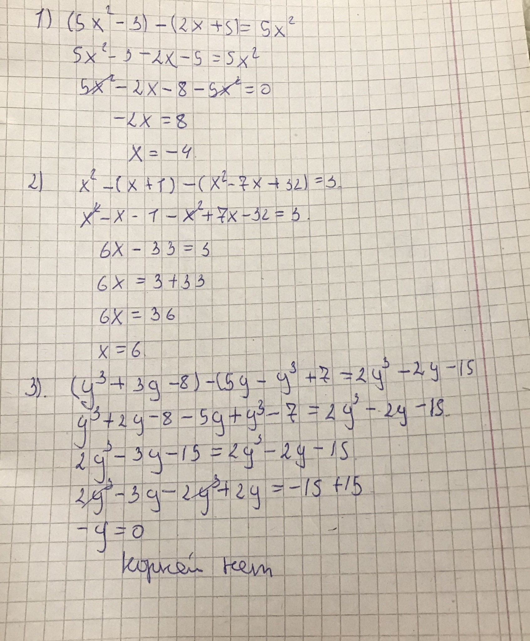 Решите уравнение (1) (5x^2-3)-(2x+5)=5x^2 (2) x^2-(x+1)-(x^2-7x+32)=3 (3) (y^3+3y-8)-(5y-y^3+7)=2y^3-2y-15