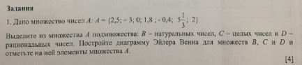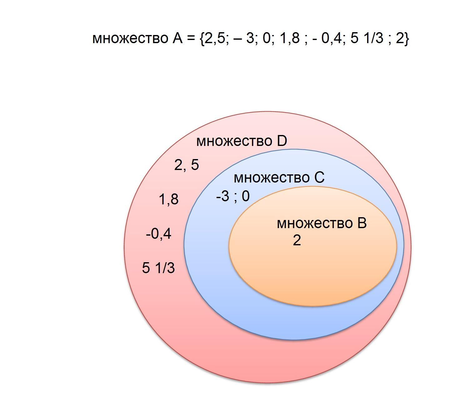 Дано множество чисел А: А = {2,5; – 3; 0; 1,8 ; — 0,4; 5 1/3 ; 2} Выделите из множества А подмножества: В – натуральных чисел, С – целых чисел и D – рациональных чисел. Постройте диаграмму Эйлера Венна для множеств В, С и D и отметьте на ней элементы множества А.