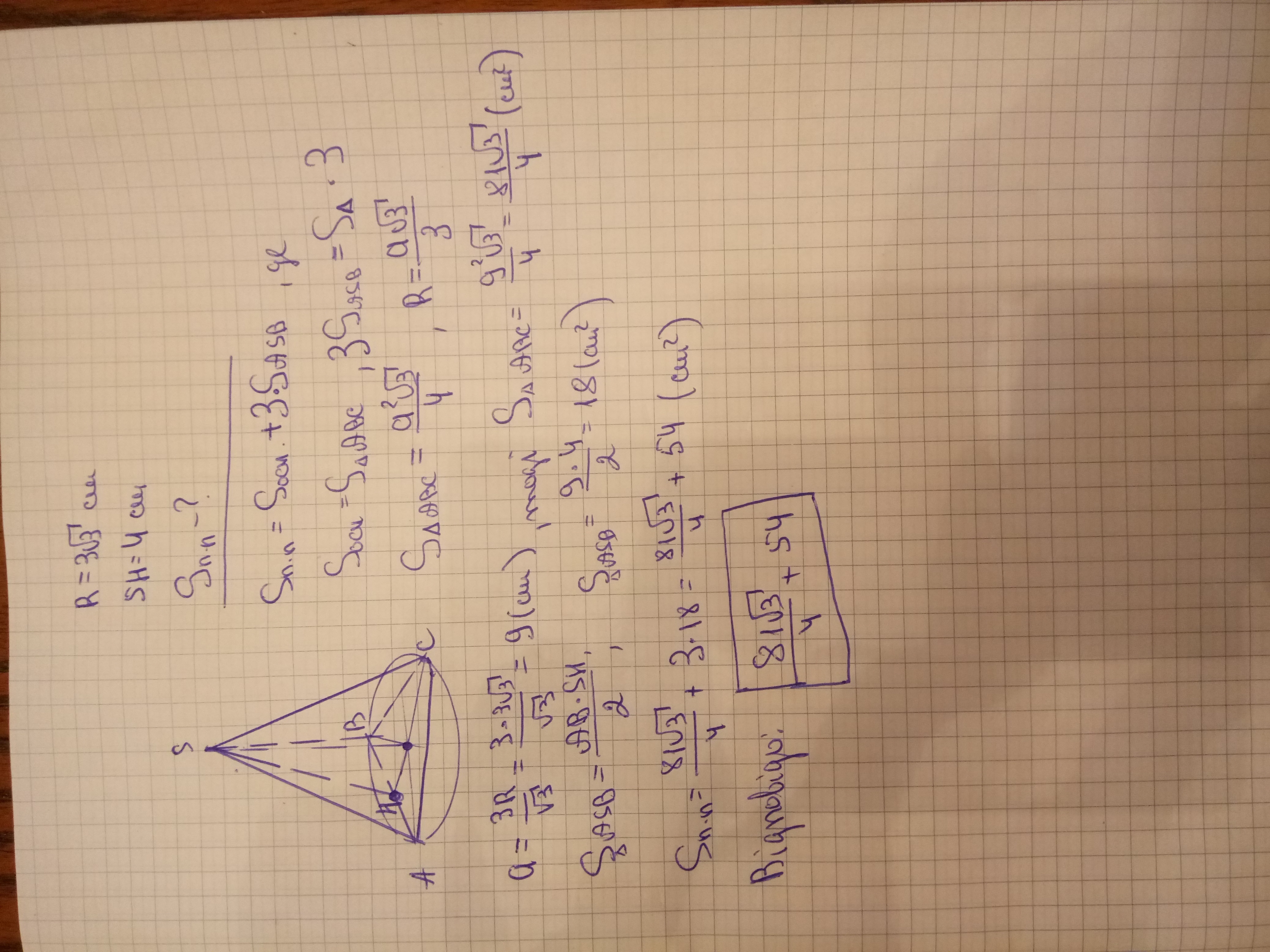 Апофема правильної трикутної піраміди дорівнює 4см а радіус кола описаного новколо основи дорівеює 3 корня із 3 . Знайдіть площу повної поверхні піраміди