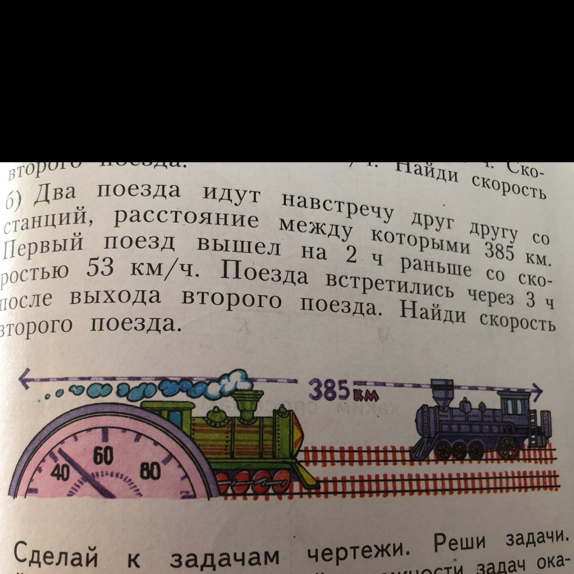 Два поезда идут навстречу друг другу со станции расстояние между которыми 385 первый поезд вышел на 2 ч раньше со скоростью 53 км/ч поезда встретились через 3 ч найди скорость второго