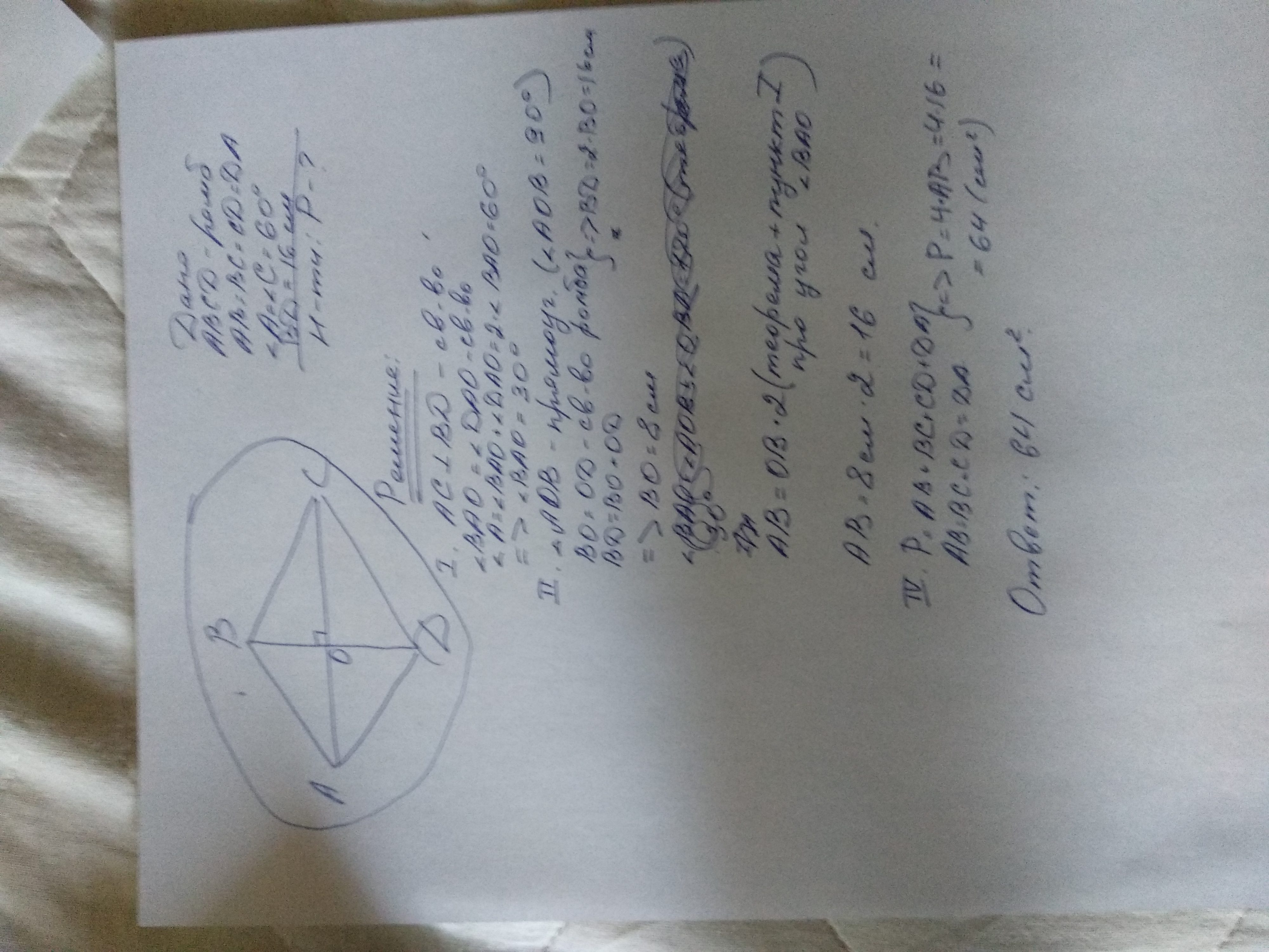 найдите периметр ромба,если один из его углов равен 60 градусов,длина меньшей диогонали равна 16см