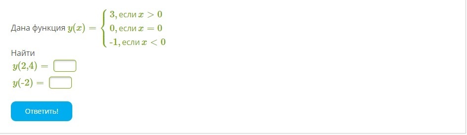 Дана функция y(x)=⎧⎩⎨⎪⎪3,еслиx>00,еслиx=0-1,еслиx<0 Найти y(2,4)= y(-2)=